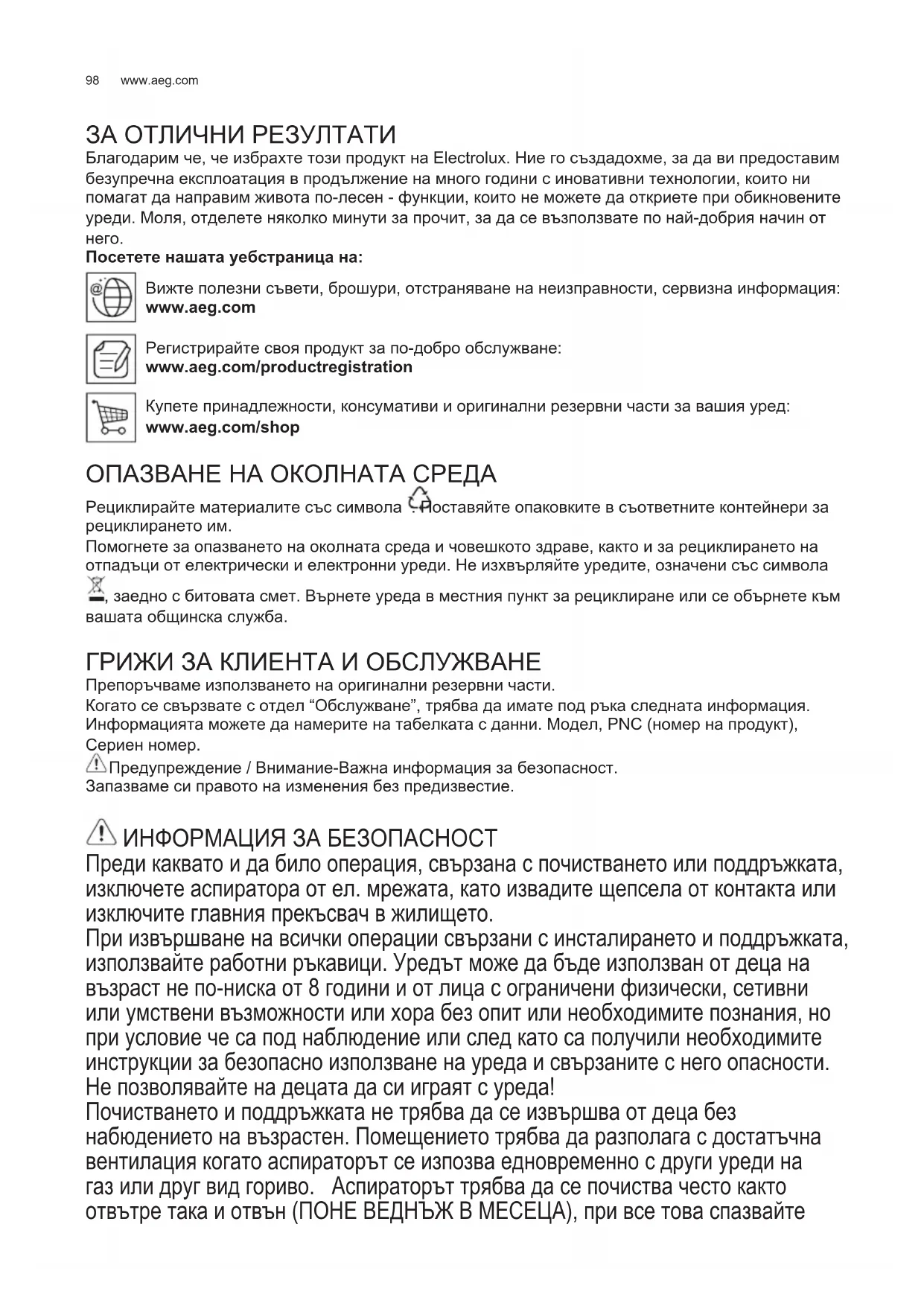 ЗА ОТЛИЧНИ РЕЗУЛТАТИ Благодарим че, че избрахте този продукт на Electrolux. Ние го създадохме, за да ви предоставим безупречна експлоатация в продължение на много години с иновативни технологии, които ни помагат да направим живота по-лесен - функции, които не можете да откриете при обикновените уреди. Моля, отделете няколко минути за прочит, за да се възползвате по най-добрия начин от