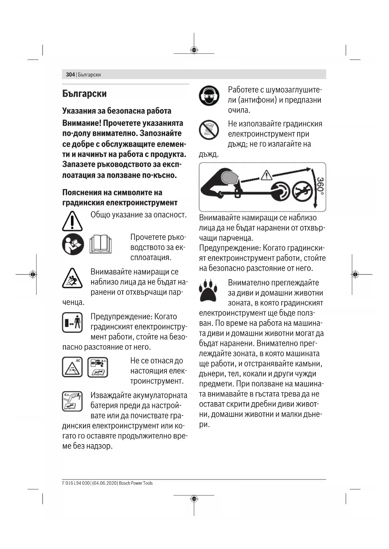 u Лицето, което обслужва машината, трябва да го ползва само съобраз- но предназначението му. При това трябва да се отчитат особеностите на конкретната ситуация. Обръ- щайте специално внимание да предпазвате намиращи се наблизо лица, особено деца. u Не допускайте тази машина да бъ- де ползвана от деца, лица с ограни- чени физически, сензорни или ду- шевни способности или лица с не- достатъчни познания и опит и/или лица, които не са запознати с тези указания. Възможно е национални нормативни документи да ограни- чават възрастта на работещия с градинския електроинструмент. Bosch Power Tools F 016 L94 030 | (04.06.2020)310 | Български u Деца трябва да бъдат под постоя- нен надзор, за да се предотврати опасността да играят с градинския електроинструмент.