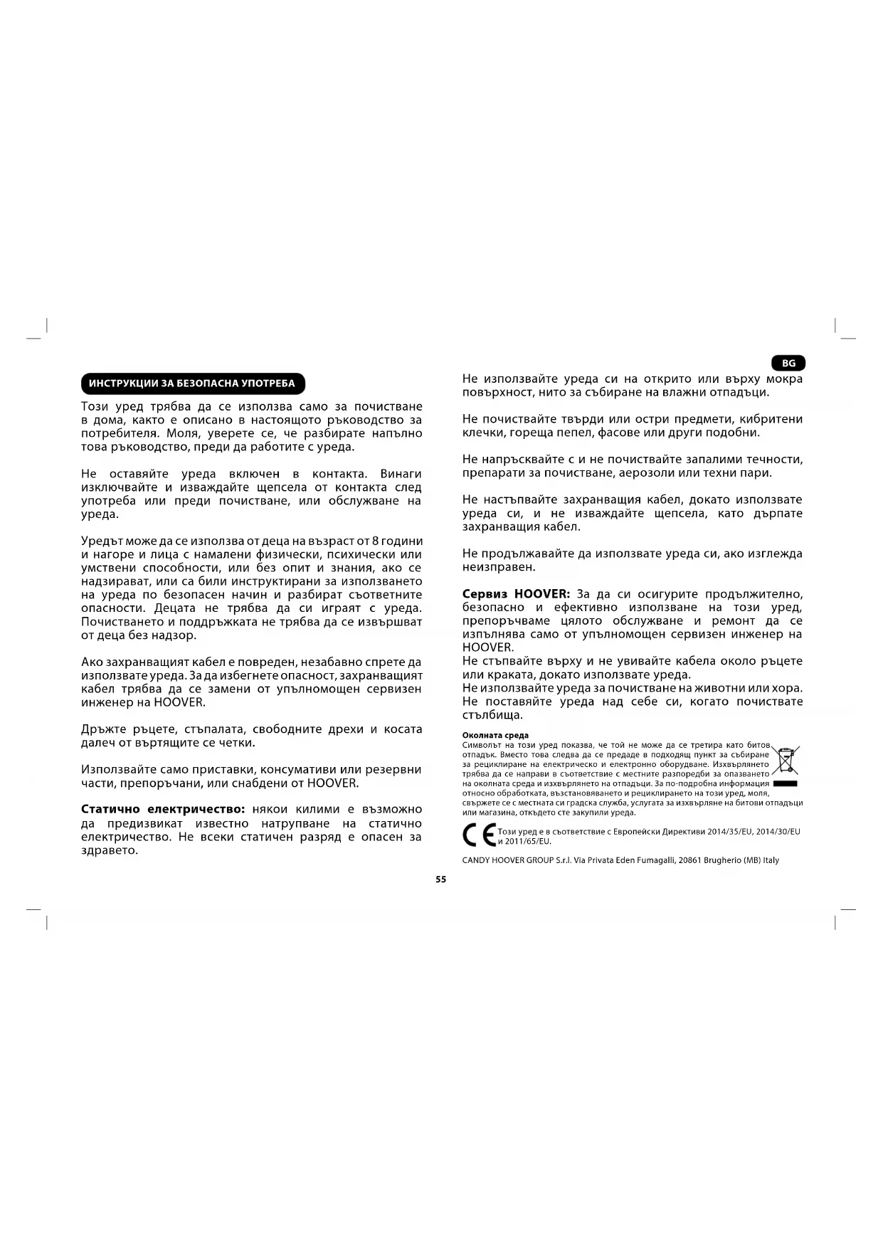 Уредът може да се използва от деца на възраст от 8 години и нагоре и лица с намалени физически, психически или умствени способности, или без опит и знания, ако се надзирават, или са били инструктирани за използването на уреда по безопасен начин и разбират съответните опасности. Децата не трябва да си играят с уреда. Почистването и поддръжката не трябва да се извършват от деца без надзор. Ако захранващият кабел е повреден, незабавно спрете да използвате уреда. За да избегнете опасност, захранващият кабел трябва да се замени от упълномощен сервизен инженер на HOOVER. Дръжте ръцете, стъпалата, свободните дрехи и косата далеч от въртящите се четки. Използвайте само приставки, консумативи или резервни части, препоръчани, или снабдени от HOOVER. Статично електричество: някои килими е възможно да предизвикат известно натрупване на статично електричество. Не всеки статичен разряд е опасен за