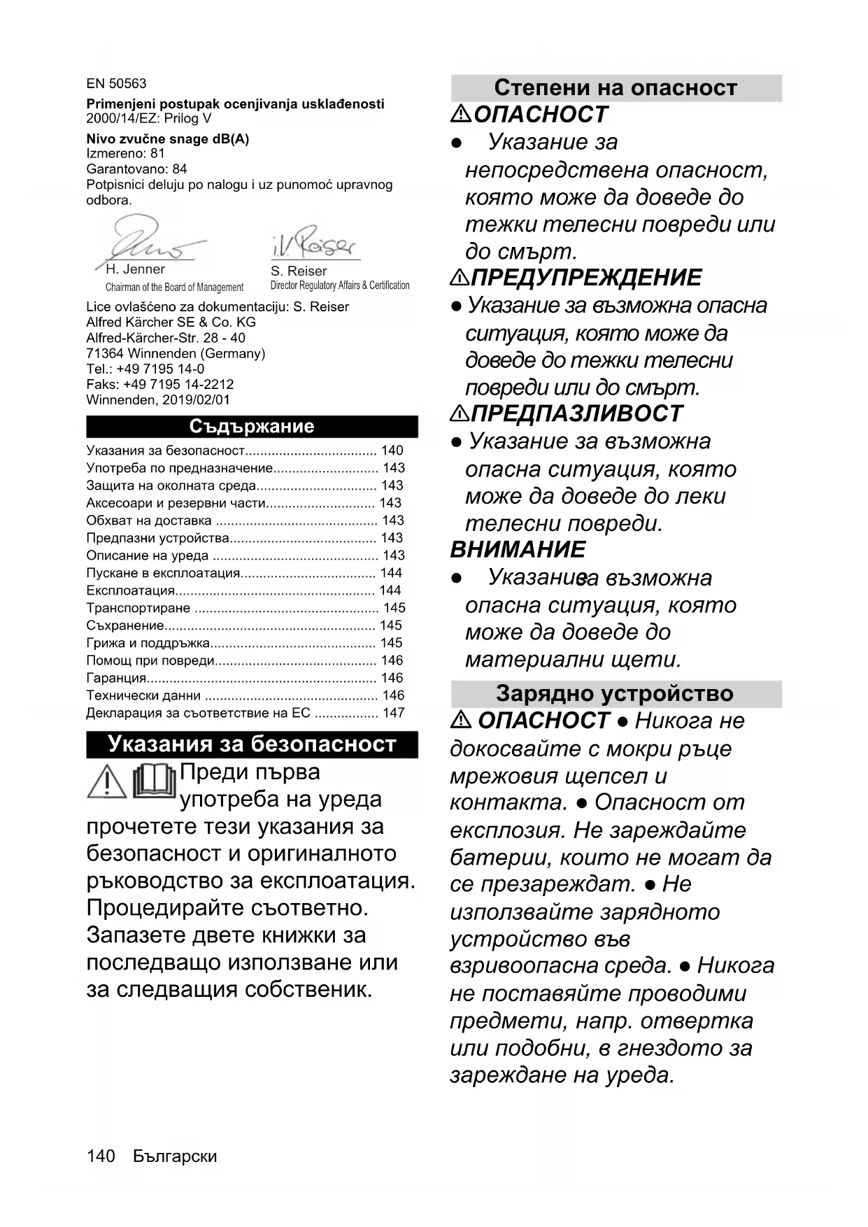 - Декларация за съответствие на ЕС Chairman of the Board of ManagementDirector Regulatory Affairs & Certification H. Jenner S. Reiser 몇 ПРЕДУПРЕЖДЕНИЕ ● Зареждайте уреда само с приложеното оригинално зарядно устройство или с одобрено от KÄRCHER зарядно устройство. ● Пазете мрежовия захранващ кабел от силна топлина, остри краища, масло и движещи се части на уреда. ● Не отваряйте зарядното устройство. Възлагайте извършването на ремонти само на специализиран персонал. ● Използвайте зарядното устройство само за зареждане на одобрени акумулаторни пакети. ● Незабавно подменяйте с оригинална част повредено зарядно устройство заедно с кабела му за зареждане. ● Уредът съдържа електрически компоненти, не почиствайте уреда под течаща вода. ● Не трябва да зареждате акумулиращата батерия по-дълго от 24 часа без прекъсване. 몇 ПРЕДПАЗЛИВОСТ ● Не използвайте зарядното устройство в мокро или p. 147