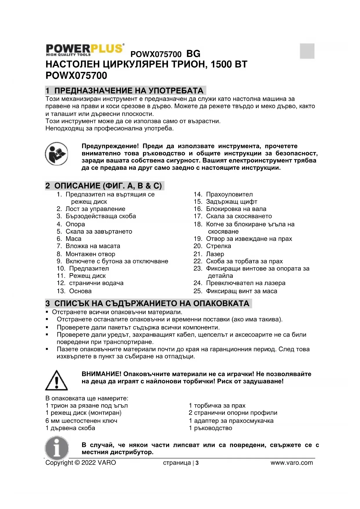 - 18 ДЕКЛАРАЦИЯ ЗА СЪОТВЕТСТВИЕ POWX075700 BG Copyright © 2022 VARO страница | 3 www.varo.com НАСТОЛЕН ЦИРКУЛЯРЕН ТРИОН, 1500 ВТ POWX075700 1 ПРЕДНАЗНАЧЕНИЕ НА УПОТРЕБАТА Този механизиран инструмент е предназначен да служи като настолна машина за правене на прави и коси срезове в дърво. Можете да режете твърдо и меко дърво, както и талашит или дървесни плоскости. Този инструмент може да се използва само от възрастни. Неподходящ за професионална употреба. Предупреждение! Преди да използвате инструмента, прочетете внимателно това ръководство и общите инструкции за безопасност, заради вашата собствена сигурност. Вашият електроинструмент трябва да се предава на друг само заедно с настоящите инструкции. 2 ОПИСАНИЕ (ФИГ. A, B & C) p. 13