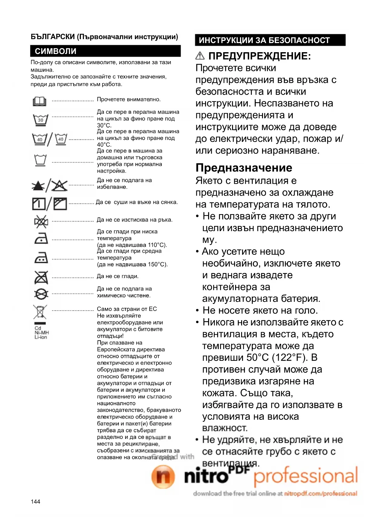 Задължително се запознайте с техните значения, преди да пристъпите към работа. ПРЕДУПРЕЖДЕНИЕ: Прочетете всички предупреждения във връзка с безопасността и всички инструкции. Неспазването на предупрежденията и инструкциите може да доведе до електрически удар, пожар и/ или сериозно нараняване. Предназначение Якето с вентилация е предназначено за охлаждане на температурата на тялото.