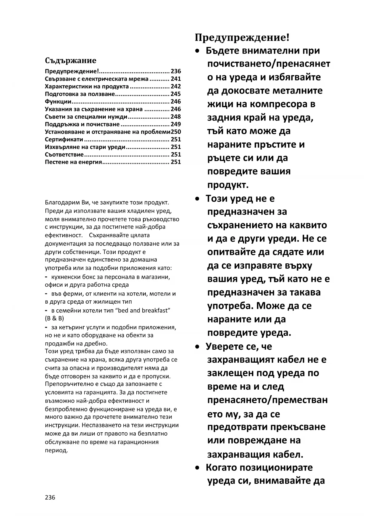 Благодарим Ви, че закупихте този продукт. Преди да използвате вашия хладилен уред, моля внимателно прочетете това ръководство с инструкции, за да постигнете най-добра ефективност. Съхранявайте цялата документация за последващо ползване или за други собственици. Този продукт е предназначен единствено за домашна употреба или за подобни приложения като: - кухненски бокс за персонала в магазини, офиси и друга работна среда - във ферми, от клиенти на хотели, мотели и в друга среда от жилищен тип - в семейни хотели тип “bed and breakfast” (B & B) - за кетъринг услуги и подобни приложения, но не и като оборудване на обекти за продажби на дребно. Този уред трябва да бъде използван само за съхранение на храна, всяка друга употреба се счита за опасна и производителят няма да бъде отговорен за каквито и да е пропуски. Препоръчително е също да запознаете с условията на гаранцията. За да постигнете възможно най-добра ефективност и безпроблемно функциониране на уреда ви, е много важно да прочетете внимателно тези инструкции. Неспазването на тези инструкции може да ви лиши от правото на безплатно обслужване по време на гаранционния