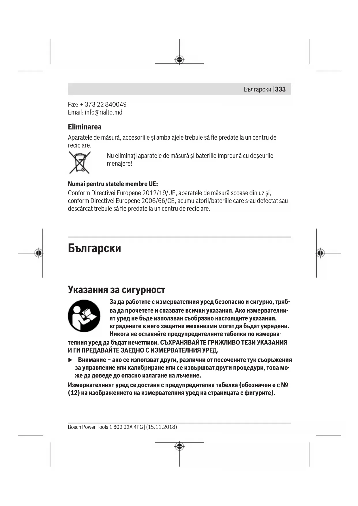 Указания за сигурност За да работите с измервателния уред безопасно и сигурно, тряб- ва да прочетете и спазвате всички указания. Ако измервателни- ят уред не бъде използван съобразно настоящите указания, вградените в него защитни механизми могат да бъдат увредени. Никога не оставяйте предупредителните табелки по измерва- телния уред да бъдат нечетливи. СЪХРАНЯВАЙТЕ ГРИЖЛИВО ТЕЗИ УКАЗАНИЯ И ГИ ПРЕДАВАЙТЕ ЗАЕДНО С ИЗМЕРВАТЕЛНИЯ УРЕД. u Внимание – ако се използват други, различни от посочените тук съоръжения за управление или калибриране или се извършват други процедури, това мо- же да доведе до опасно излагане на лъчение. Измервателният уред се доставя с предупредителна табелка (обозначен е с № (12) на изображението на измервателния уред на страницата с фигурите). Български | 333 Bosch Power Tools 1 609 92A 4RG | (15.11.2018)334 | Български 1 609 92A 4RG | (15.11.2018) Bosch Power Tools u Ако текстът на предупредителната табела не е на Вашия език, залепете пре- ди първата експлоатация отгоре върху него доставения стикер на Вашия