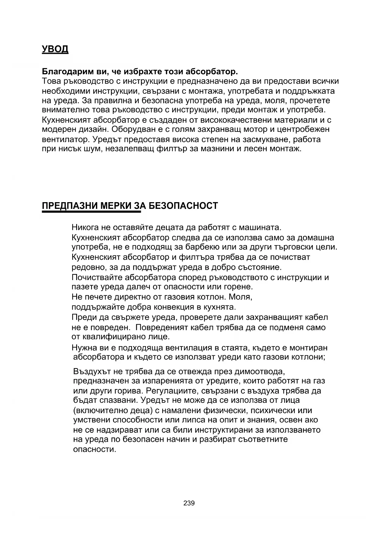 238УВОД Благодарим ви, че избрахте този абсорбатор. Това ръководство с инструкции е предназначено да ви предостави всички необходими инструкции, свързани с монтажа, употребата и поддръжката на уреда. За правилна и безопасна употреба на уреда, моля, прочетете внимателно това ръководство с инструкции, преди монтаж и употреба. Кухненският абсорбатор е създаден от висококачествени материали и с модерен дизайн. Оборудван е с голям захранващ мотор и центробежен вентилатор. Уредът предоставя висока степен на засмукване, работа при нисък шум, незалепващ филтър за мазнини и лесен монтаж. ПРЕДПАЗНИ МЕРКИ ЗА БЕЗОПАСНОСТ Никога не оставяйте децата да работят с машината. Кухненският абсорбатор следва да се използва само за домашна употреба, не е подходящ за барбекю или за други търговски цели. Кухненският абсорбатор и филтъра трябва да се почистват редовно, за да поддържат уреда в добро състояние. Почиствайте абсорбатора според ръководството с инструкции и пазете уреда далеч от опасности или горене. Не печете директно от газовия котлон. Моля, поддържайте добра конвекция в кухнята. Преди да свържете уреда, проверете дали захранващият кабел не е повреден. Повреденият кабел трябва да се подменя само от квалифицирано лице. Нужна ви е подходяща вентилация в стаята, където е монтиран абсорбатора и където се използват уреди като газови котлони; Въздухът не трябва да се отвежда през димоотвода, предназначен за изпаренията от уредите, които работят на газ или други горива. Регулациите, свързани с въздуха трябва да бъдат спазвани. Уредът не може да се използва от лица (включително деца) с намалени физически, психически или умствени способности или липса на опит и знания, освен ако не се надзирават или са били инструктирани за използването на уреда по безопасен начин и разбират съответните