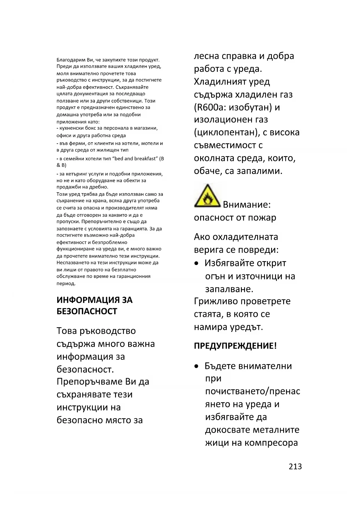ИНФОРМАЦИЯ ЗА БЕЗОПАСНОСТ Това ръководство съдържа много важна информация за безопасност. Препоръчваме Ви да съхранявате тези инструкции на безопасно място за лесна справка и добра работа с уреда. Хладилният уред съдържа хладилен газ (R600a: изобутан) и изолационен газ (циклопентан), с висока съвместимост с околната среда, които, обаче, са запалими.