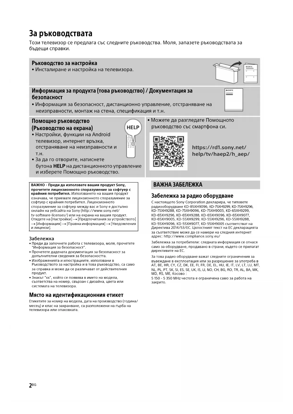 - Преди да започнете работа с телевизора, моля, прочетете “Информация за безопасност”.• Прочетете дадената документация за безопасност за допълнителни сведения за безопасността.• Изображенията и илюстрациите, използвани в Ръководството за настройка и в това ръководство, са само за справка и може да се различават от действителния продукт.• Знакът “xx”, който се появява в името на модела, съответства на номер, свързан с дизайнa, цвета или системата на телевизора. Място на идентификационния етикет Етикетите за номер на модела, дата на производство (година/месец) и клас на захранване, са разположени на гърба на телевизора или опаковката. ВАЖНА ЗАБЕЛЕЖКА Забележка за радио оборудване С настоящото Sony Corporation декларира, че типовете радиооборудване KD-85XH9096, KD-75XH9299, KD-75XH9296, KD-75XH9288, KD-75XH9096, KD-75XH9005, KD-65XH9299, KD-65XH9296, KD-65XH9288, KD-65XH9096, KD-65XH9077, KD-65XH9005, KD-55XH9299, KD-55XH9296, KD-55XH9288, KD-55XH9096, KD-55XH9077, KD-55XH9005 съответстват на Директива 2014/53/ЕС. Цялостният текст на ЕС декларацията за съответствие може да се намери на следния интернет адрес: http://www.compliance.sony.eu/Забележка за потребители: следната информация се отнася само за оборудване, продавано в страни, където се прилагат директивите на ЕС.За това радио оборудване важат следните ограничения за въвеждане в експлоатация или за разрешение за употреба в AT, BE, HR, CY, CZ, DK, EE, FI, FR, DE, EL, HU, IE, IT, LV, LT, LU, MT, NL, PL, PT, SK, SI, ES, SE, UK, IS, LI, NO, CH, BG, RO, TR, AL, BA, MK, MD, RS, ME, Косово : 5 150 - 5 350 MHz честота е ограничена само за работа на За ръководствата Този телевизор се предлага със следните ръководства. Моля, запазете ръководствата за бъдещи справки. Ръководство за настройка