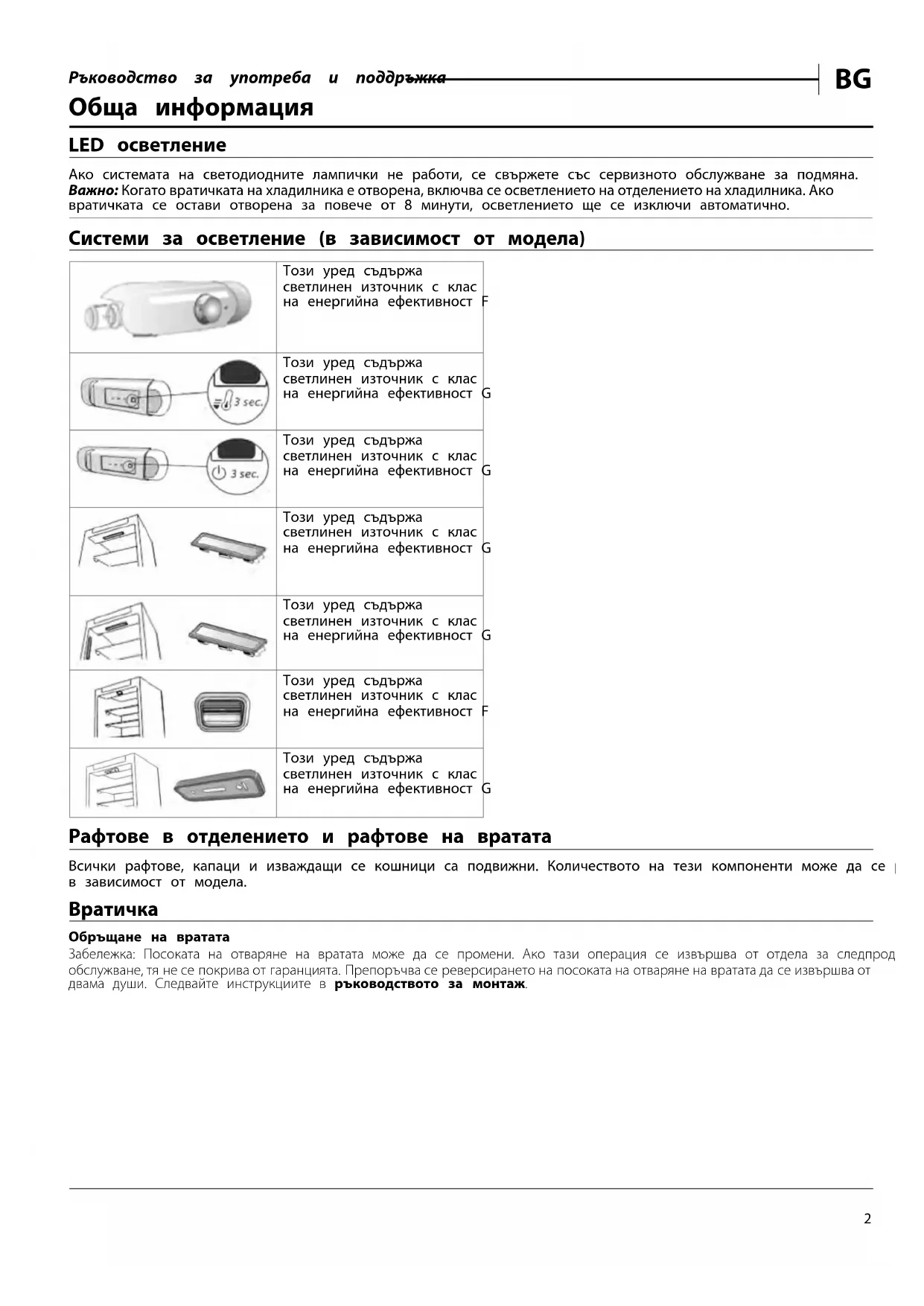 Обща информация LED осветление Ако системата на светодиодните лампички не работи, се свържете със сервизното обслужване за подмяна. Важно: Когато вратичката на хладилника е отворена, включва се осветлението на отделението на хладилника. Ако вратичката се остави отворена за повече от 8 минути, осветлението ще се изключи автоматично. Системи за осветление (в зависимост от модела) Този уред съдържа светлинен източник с клас на енергийна ефективност F Този уред съдържа светлинен източник с клас на енергийна ефективност G Този уред съдържа светлинен източник с клас на енергийна ефективност G Този уред съдържа светлинен източник с клас на енергийна ефективност G Този уред съдържа светлинен източник с клас на енергийна ефективност G Този уред съдържа светлинен източник с клас на енергийна ефективност F Този уред съдържа светлинен източник с клас на енергийна ефективност G Рафтове в отделението и рафтове на вратата Всички рафтове, капаци и изваждащи се кошници са подвижни. Количеството на тези компоненти може да се различава в зависимост от модела.