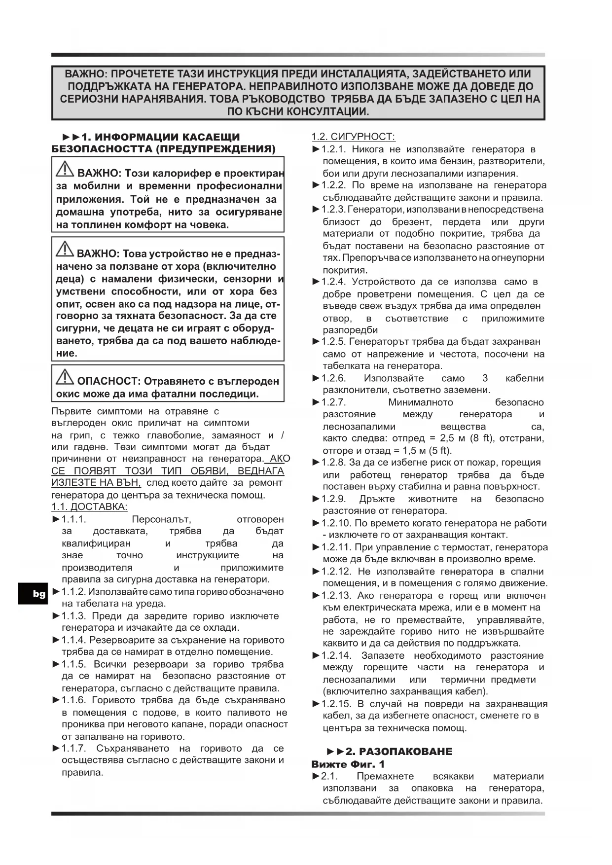 ►1.2.5. Генераторът трябва да бъдат захранван само от напрежение и честота, посочени на табелката на генератора. ►1.2.6. Използвайте само 3 кабелни разклонители, съответно заземени. ►1.2.7. Минималното безопасно разстояние между генератора и леснозапалими вещества са, както следва: отпред = 2,5 м (8 ft), отстрани, отгоре и отзад = 1,5 м (5 ft). ►1.2.8. За да се избегне риск от пожар, горещия или работещ генератор трябва да бъде поставен върху стабилна и равна повърхност. ►1.2.9. Дръжте животните на безопасно разстояние от генератора. ►1.2.10. По времето когато генератора не работи - изключете го от захранващия контакт. ►1.2.11. При управление с термостат, генератора може да бъде включван в произволно време. ►1.2.12. Не използвайте генератора в спални помещения, и в помещения с голямо движение. ►1.2.13. Ако генератора е горещ или включен към електрическата мрежа, или е в момент на работа, не го премествайте, управлявайте, не зареждайте гориво нито не извършвайте каквито и да са действия по поддръжката. ►1.2.14. Запазете необходимото разстояние между горещите части на генератора и леснозапалими или термични предмети (включително захранващия кабел). ►1.2.15. В случай на повреди на захранващия кабел, за да избегнете опасност, сменете го в центъра за техническа помощ. ►►2. РАЗОПАКОВАНЕ Вижте Фиг. 1 ►2.1. Премахнете всякакви материали използвани за опаковка на генератора, съблюдавайте действащите закони и правила.