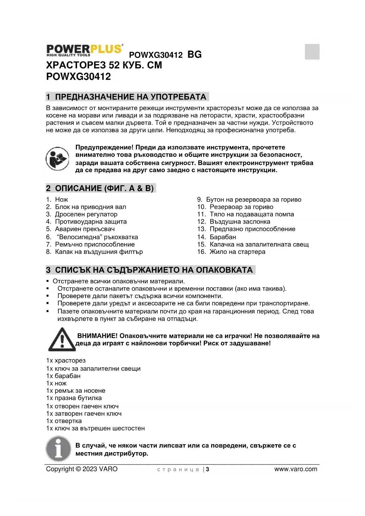- 19 ДЕКЛАРАЦИЯ ЗА СЪОТВЕТСТВИЕ POWXG30412 BG Copyright © 2023 VARO с т р а н и ц а | 3 www.varo.com ХРАСТОРЕЗ 52 КУБ. СМ POWXG30412 1 ПРЕДНАЗНАЧЕНИЕ НА УПОТРЕБАТА В зависимост от монтираните режещи инструменти храсторезът може да се използва за косене на морави или ливади и за подрязване на леторасти, храсти, храстообразни растения и съвсем малки дървета. Той е предназначен за частни нужди. Устройството не може да се използва за други цели. Неподходящ за професионална употреба. Предупреждение! Преди да използвате инструмента, прочетете внимателно това ръководство и общите инструкции за безопасност, заради вашата собствена сигурност. Вашият електроинструмент трябва да се предава на друг само заедно с настоящите инструкции. 2 ОПИСАНИЕ (ФИГ. A & B) p. 18