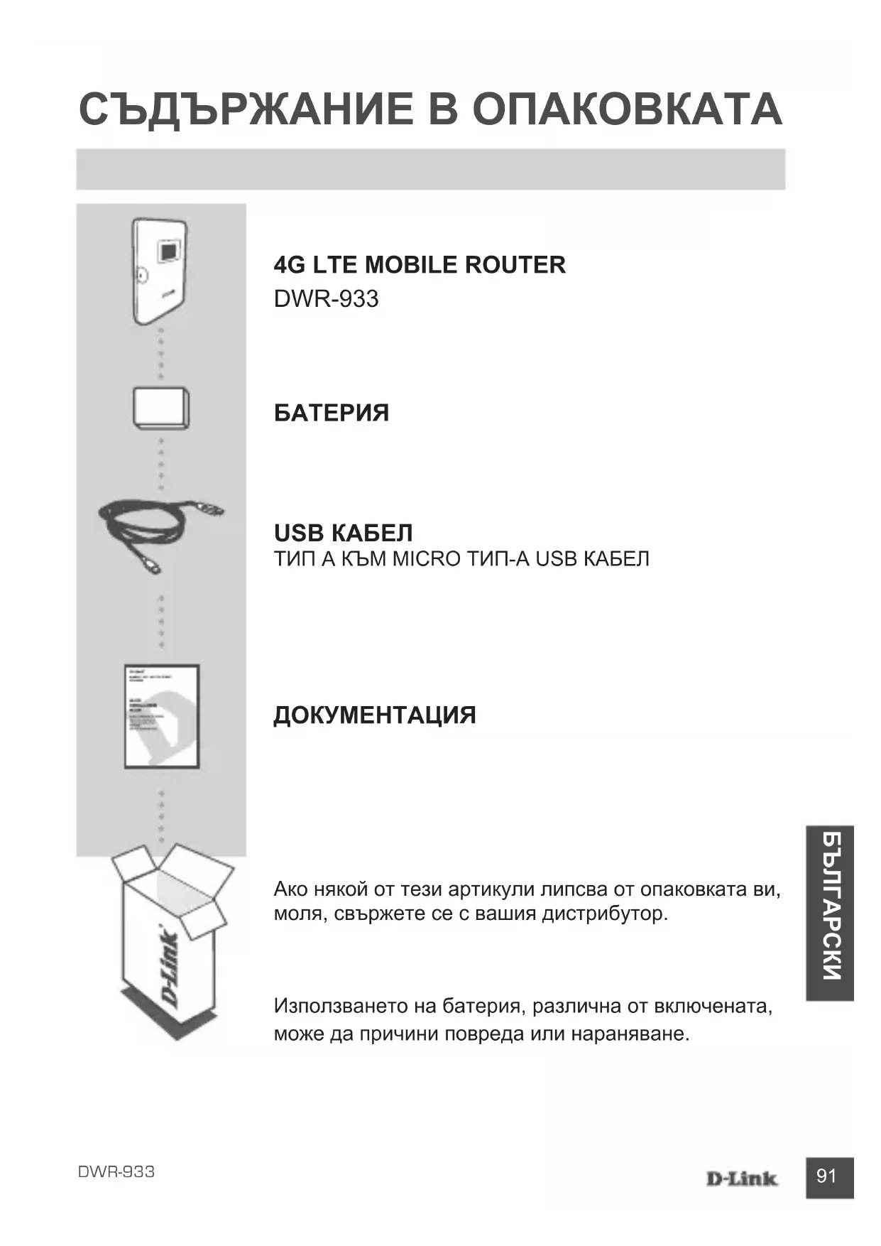 Ако някой от тези артикули липсва от опаковката ви, моля, свържете се с вашия дистрибутор. Използването на батерия, различна от включената, може да причини повреда или нараняване. ДОКУМЕНТАЦИЯ92 DWR-933