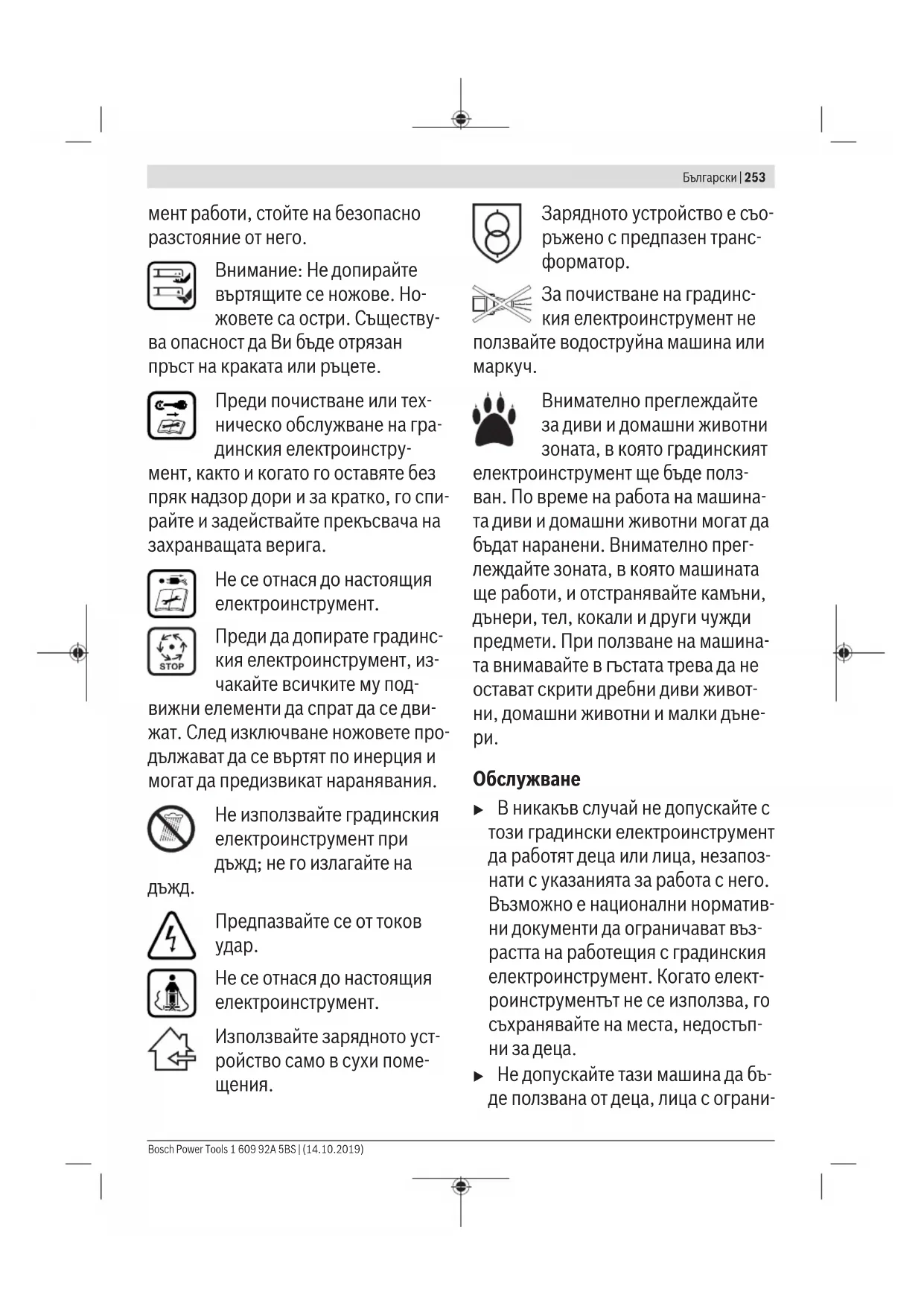 Предупреждение: Когато градинският електроинстру- 1 609 92A 5BS | (14.10.2019) Bosch Power ToolsБългарски | 253 мент работи, стойте на безопасно разстояние от него. Внимание: Не допирайте въртящите се ножове. Но- жовете са остри. Съществу- ва опасност да Ви бъде отрязан пръст на краката или ръцете. Преди почистване или тех- ническо обслужване на гра- динския електроинстру- мент, както и когато го оставяте без пряк надзор дори и за кратко, го спи- райте и задействайте прекъсвача на захранващата верига. Не се отнася до настоящия електроинструмент. Преди да допирате градинс- кия електроинструмент, из- чакайте всичките му под- вижни елементи да спрат да се дви- жат. След изключване ножовете про- дължават да се въртят по инерция и могат да предизвикат наранявания. Не използвайте градинския електроинструмент при дъжд; не го излагайте на