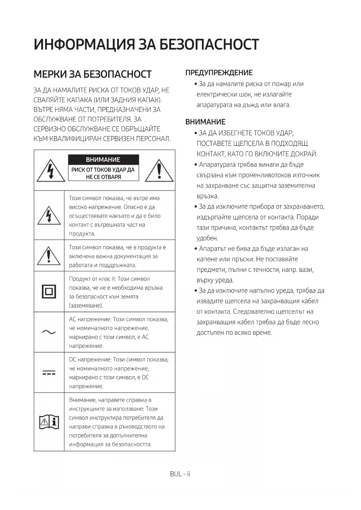 РИСК ОТ ТОКОВ УДАР ДА НЕ СЕ ОТВАРЯТози символ показва, че вътре има високо напрежение. Опасно е да осъществявате какъвто и да е било контакт с вътрешната част на продукта.Този символ показва, че в продукта е включена важна документация за работата и поддръжката.Продукт от клас II: Този символ показва, че не е необходима връзка за безопасност към земята (заземяване).AC напрежение: Този символ показва, че номиналното напрежение, маркирано с този символ, е AC напрежение.DC напрежение: Този символ показва, че номиналното напрежение, маркирано с този символ, е DC напрежение.Внимание, направете справка в инструкциите за използване: Този символ инструктира потребителя да направи справка в ръководството на потребителя за допълнителна информация за безопасността. ПРЕДУПРЕЖДЕНИЕ