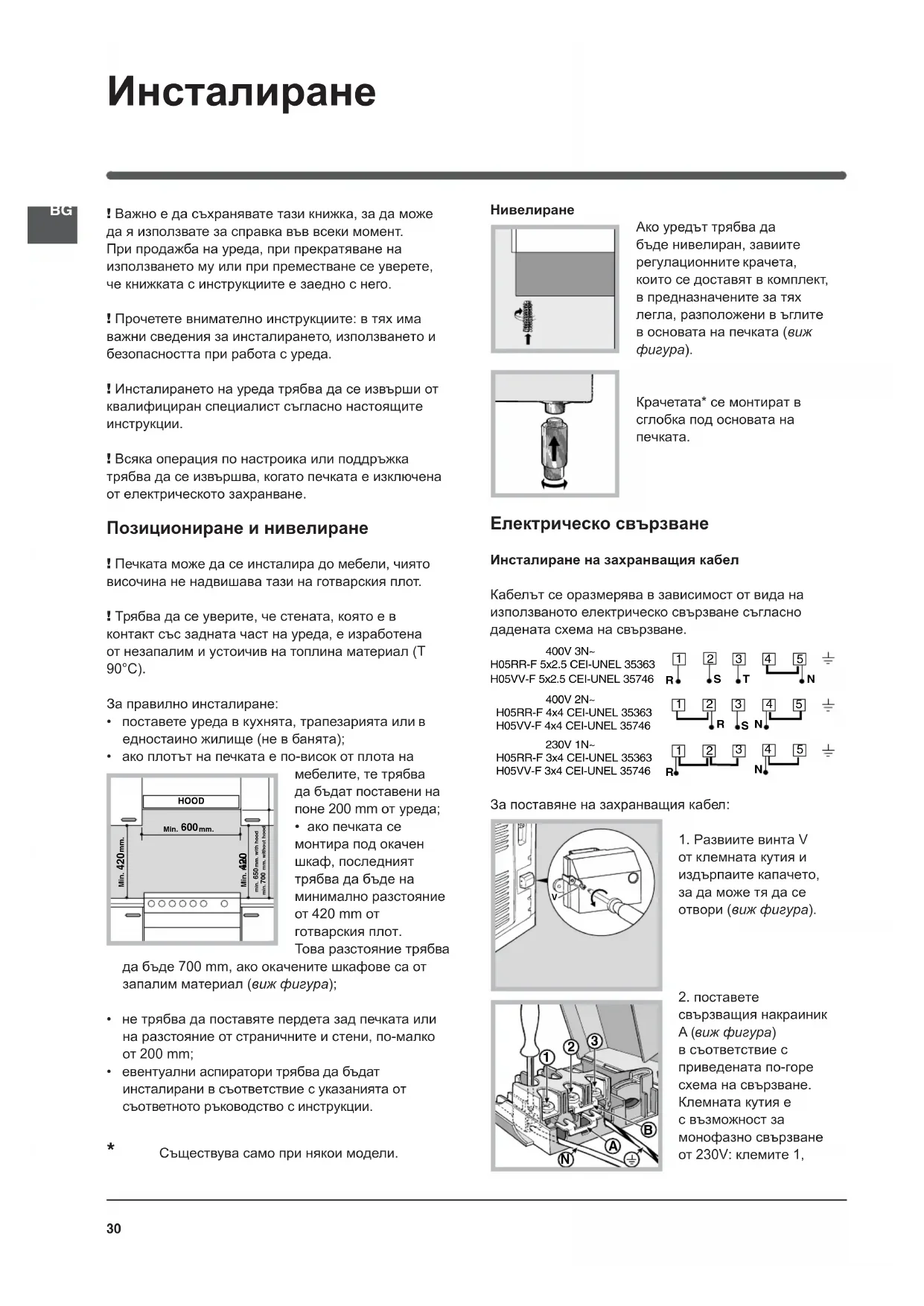 ! Важно е да съхранявате тази книжка, за да може да я използвате за справка във всеки момент. При продажба на уреда, при прекратяване на използването му или при преместване се уверете, че книжката с инструкциите е заедно с него. ! Прочетете внимателно инструкциите: в тях има важни сведения за инсталирането , използването и безопасността при работа с уреда. ! Инсталирането на уреда трябва да се извърши от квалифициран специалист съгласно настоящите инструкции. ! Всяка операция по настроика или поддръжка трябва да се извършва, когато печката е изключена от електрическото захранване. Позициониране и нивелиране ! Печката може да се инсталира до мебели, чиято височина не надвишава тази на готварския плот. ! Трябва да се уверите, че стената, която е в контакт със задната част на уреда, е изработена от незапалим и устоичив на топлина материал (T 90°C). За правилно инсталиране: