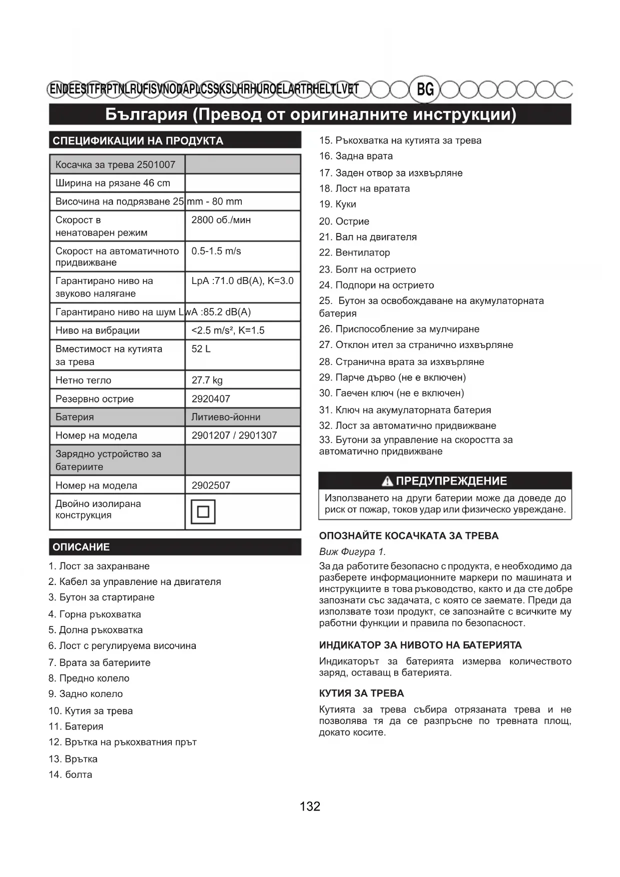 EN DE ES IT FR PT NL RU FI SV NO DA PL CS SK SL HR HU RO EL AR TR HE LT LV ET СПЕЦИФИКАЦИИ НА ПРОДУКТАКосачка за трева 2501007Ширина на рязане 46 cmВисочина на подрязване 25 mm - 80 mmСкорост вненатоварен режим2800 об./минСкорост на автоматичнотопридвижване0.5-1.5 m/sГарантирано ниво на звуково наляганеLpA :71.0 dB(A), K=3.0Гарантирано ниво на шум LwA :85.2 dB(A)Ниво на вибрации <2.5 m/s², K=1.5Вместимост на кутията за трева 52 L Нетно тегло 27.7 kgРезервно острие 2920407Батерия Литиево-йонниНомер на модела 2901207 / 2901307Зарядно устройство за батериитеНомер на модела 2902507Двойно изолирана конструкцияОПИСАНИЕ1. Лост за захранване2. Кабел за управление на двигателя3. Бутон за стартиране4. Горна ръкохватка5. Долна ръкохватка6. Лост с регулируема височина7. Врата за батериите8. Предно колело9. Задно колело10. Кутия за трева11. Батерия12. Врътка на ръкохватния прът13. Врътка болта15. Ръкохватка на кутията за трева16. Задна врата17. Заден отвор за изхвърляне18. Лост на вратата19. Куки20. Острие21. Вал на двигателя22. Вентилатор23. Болт на острието24. Подпори на острието25. Бутон за освобождаване на акумулаторната батерия26. Приспособление за мулчиране27. Отклон ител за странично изхвърляне28. Странична врата за изхвърляне29. Парче дърво (не е включен)30. Гаечен ключ (не е включен)31. Ключ на акумулаторната батерия32. Лост за автоматично придвижване 33. Бутони за управление на скоростта за автоматично придвижване ПРЕДУПРЕЖДЕНИЕ Използването на други батерии може да доведе до риск от пожар, токов удар или физическо увреждане. ОПОЗНАЙТЕ КОСАЧКАТА ЗА ТРЕВАВиж Фигура 1. За да работите безопасно с продукта, е необходимо да разберете информационните маркери по машината и инструкциите в това ръководство, както и да сте добре запознати със задачата, с която се заемате. Преди да използвате този продукт, се запознайте с всичките му работни функции и правила по безопасност.ИНДИКАТОР ЗА НИВОТО НА БАТЕРИЯТА Индикаторът за батерията измерва количеството заряд, оставащ в батерията.КУТИЯ ЗА ТРЕВА Кутията за трева събира отрязаната трева и не позволява тя да се разпръсне по тревната площ, докато косите. 132България (Превод от оригиналните инструкции)