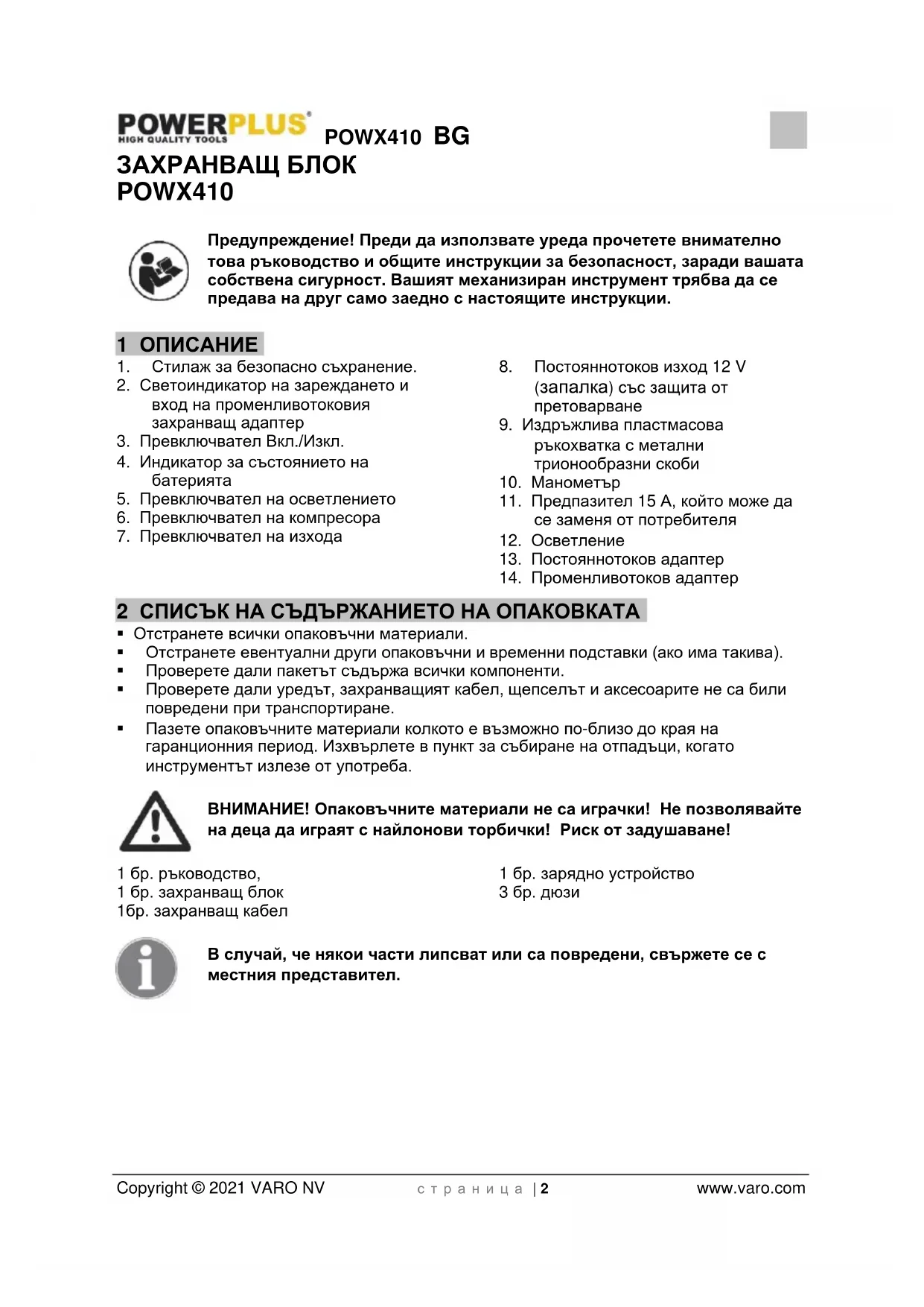 - 12 ДЕКЛАРАЦИЯ ЗА СЪОТВЕТСТВИЕ POWX410 BG Copyright © 2021 VARO NV с т р а н и ц а | 2 www.varo.com ЗАХРАНВАЩ БЛОК POWX410 Предупреждение! Преди да използвате уреда прочетете внимателно това ръководство и общите инструкции за безопасност, заради вашата собствена сигурност. Вашият механизиран инструмент трябва да се предава на друг само заедно с настоящите инструкции. 1 ОПИСАНИЕ p. 10
