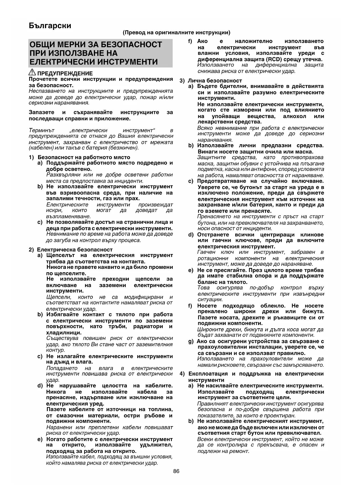 инструменти a) Не насилвайте електрическите инструменти. Използвайте подходящ електрически инструмент за съответните цели. Правилният електрически инструмент осигурява безопасна и по-добре свършена работа при показателите, за които е проектиран. b) Не използвайте електрическият инструмент, ако не може да бъде включен или изключен от съответния старт бутон или превключвател. Всеки електрически инструмент, който не може да се контролира с прекъсвача, е опасен и подлежи на ремонт. ОБЩИ МЕРКИ ЗА БЕЗОПАСНОСТ ПРИ ИЗПОЛЗВАНЕ НА ЕЛЕКТРИЧЕСКИ ИНСТРУМЕНТИ ПРЕДУПРЕЖДЕНИЕ Прочетете всички инструкции и предупреждения за безопасност. Неспазването на инструкциите и предупрежденията може да доведе до електрически удар, пожар и/или сериозни наранявания. Запазете и съхранявайте инструкциите за последващи справки и приложение. Терминът „електрически инструмент“ в предупрежденията се отнася до Вашия електрически инструмент, захранван с електричество от мрежата