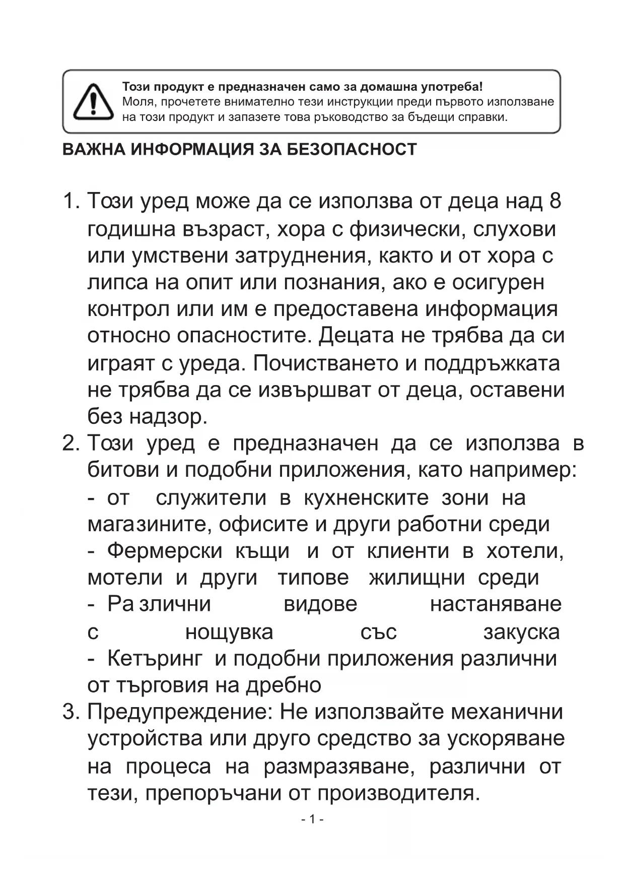 ждение: Не използвайте механични устройства или друго средство за ускоряване на процеса на размразяване, различни от тези, препоръчани от производителя.- 2 -