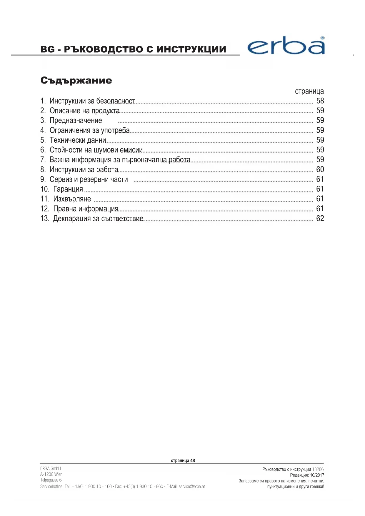 62ERBA GmbH A-1230 Wien Talpagasse 6 Servicehotline: Tel: +43(0) 1 930 10 - 160 · Fax: +43(0) 1 930 10 - 960 · E-Mail: service@erba.at Ръководство с инструкции 13286 Редакция: 10/2017 Запазваме си правото на изменения, печатни, пунктуационни и други грешки! страница 49 BG - РЪКОВОДСТВО С ИНСТРУКЦИИ Прочетете този материал, преди да използвате продукта. Ако не го прочетете, може да се стигне до сериозни наранявания. ЗАПАЗЕТЕ ТОВА РЪКОВОДСТВО Когато давате тази машина на други лица, винаги прилагайте това ръководство към нея. Не поемаме отговорност за инциденти или повреди, произтичащи от неправилна употреба. Премахването/модифицирането на всякакви защитни механизми на машината ще доведе до загуба на гаранцията. Купувачът поема целия риск и отговорност, произтичащи от негови евентуални поправки/изменения на оригиналния продукт или по-нататъшни резервни части, или произтичащи от монтаж на резервни части от негова страна.