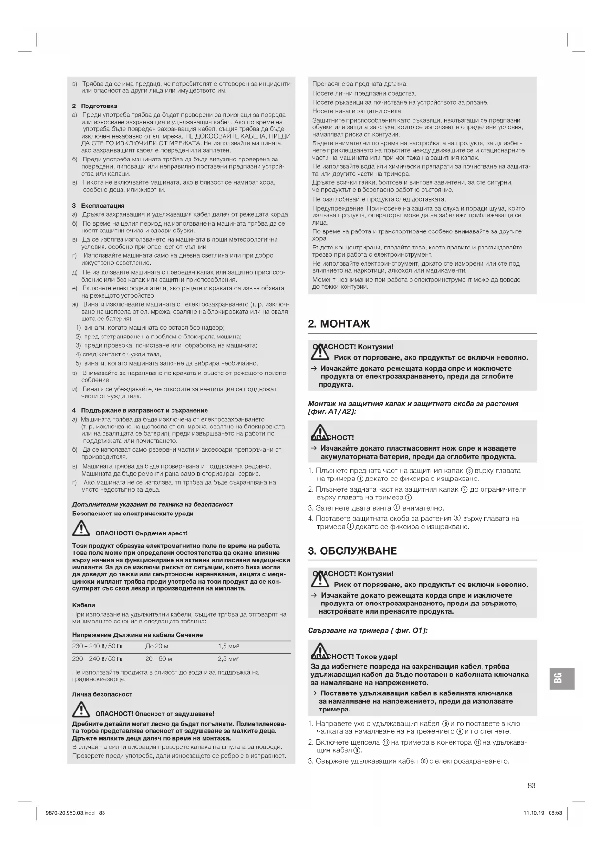 в) Трябва да се има предвид, че потребителят е отговорен за инциденти или опасност за други лица или имуществото им. 2 Подготовка a) Преди употреба трябва да бъдат проверени за признаци за повреда или износване захранващия и удължаващия кабел. Ако по време на употреба бъде повреден захранващия кабел, същия трябва да бъде изключен незабавно от ел. мрежа. НЕ ДОКОСВАЙТЕ КАБЕЛА, ПРЕДИ ДА СТЕ ГО ИЗКЛЮЧИЛИ ОТ МРЕЖАТА. Не използвайте машината, ако захранващият кабел е повреден или заплетен. б) Преди употреба машината трябва да бъде визуално проверена за повредени, липсващи или неправилно поставени предпазни устрой- ства или капаци. в) Никога не включвайте машината, ако в близост се намират хора, особено деца, или животни. 3 Експлоатация a) Дръжте захранващия и удължаващия кабел далеч от режещата корда. б) По време на целия период на използване на машината трябва да се носят защитни очила и здрави обувки. в) Да се избягва използването на машината в лоши метеорологични условия, особено при опасност от мълнии. г) Използвайте машината само на дневна светлина или при добро изкуствено осветление. д) Не използвайте машината с повреден капак или защитно приспосо- бление или без капак или защитни приспособления. е) Включете електродвигателя, ако ръцете и краката са извън обхвата на режещото устройство. ж) Винаги изключвайте машината от електрозахранването (т. р. изключ- ване на щепсела от ел. мрежа, сваляне на блокировката или на сваля- щата се батерия)