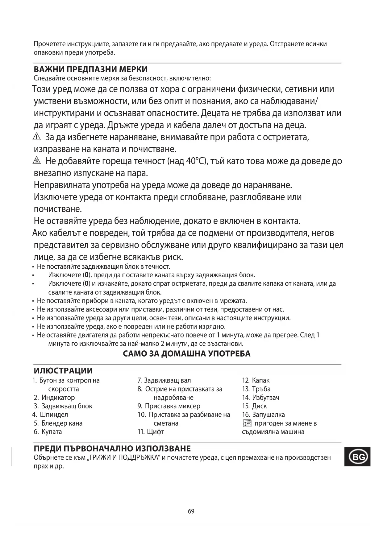 Прочетете инструкциите, запазете ги и ги предавайте, ако предавате и уреда. Отстранете всички опаковки преди употреба. ВАЖНИ ПРЕДПАЗНИ МЕРКИ Следвайте основните мерки за безопасност, включително: Този уред може да се ползва от хора с ограничени физически, сетивни или умствени възможности, или без опит и познания, ако са наблюдавани/ инструктирани и осъзнават опасностите. Децата не трябва да използват или да играят с уреда. Дръжте уреда и кабела далеч от достъпа на деца. c За да избегнете нараняване, внимавайте при работа с остриетата, изпразване на каната и почистване. h Не добавяйте гореща течност (над 40°C), тъй като това може да доведе до внезапно изпускане на пара. Неправилната употреба на уреда може да доведе до нараняване. Изключете уреда от контакта преди сглобяване, разглобяване или почистване. Не оставяйте уреда без наблюдение, докато е включен в контакта. Ако кабелът е повреден, той трябва да се подмени от производителя, негов представител за сервизно обслужване или друго квалифицирано за тази цел лице, за да се избегне всякакъв риск.