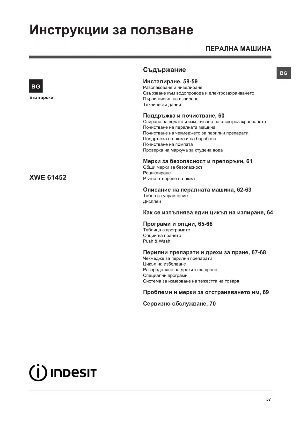Инсталиране, 58-59 Разопаковане и нивелиране Свързване към водопровода и електрозахранването Първи цикъл на изпиране Технически данни Поддръжка и почистване, 60 Спиране на водата и изключване на електрозахранването Почистване на пералната машина Почистване на чекмеджето за перилни препарати Поддръжка на люка и на барабана Почистване на помпата Проверка на маркуча за студена вода Мерки за безопасност и препоръки, 61 Общи мерки за безопасност Рециклиране