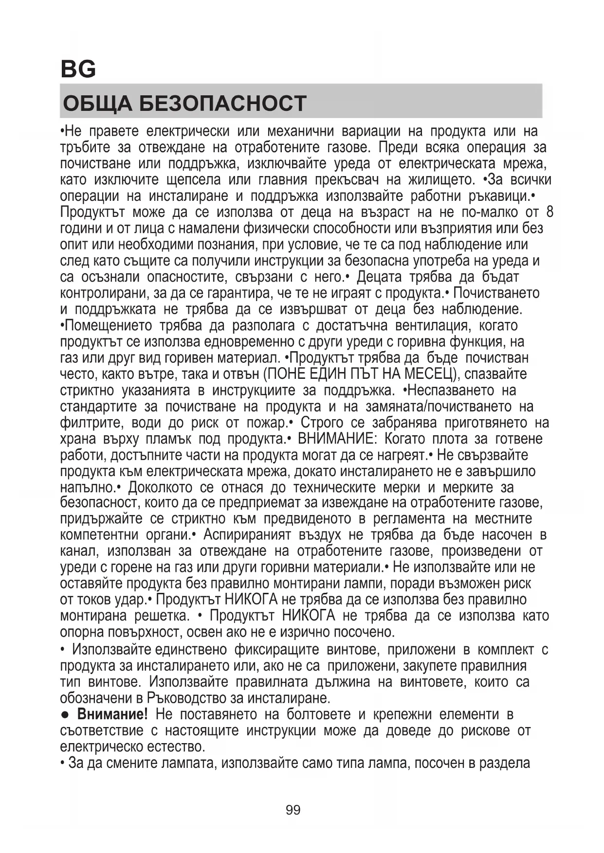 - Помещението трябва да разполага с достатъчна вентилация, когато продуктът се използва едновременно с други уреди с горивна функция, на газ или друг вид горивен материал. •Продуктът трябва да бъде почистван често, както вътре, така и отвън (ПОНЕ ЕДИН ПЪТ НА МЕСЕЦ), спазвайте стриктно указанията в инструкциите за поддръжка. •Неспазването на стандартите за почистване на продукта и на замяната/почистването на филтрите, води до риск от пожар.• Строго се забранява приготвянето на храна върху пламък под продукта.• ВНИМАНИЕ: Когато плота за готвене работи, достъпните части на продукта могат да се нагреят.• Не свързвайте продукта към електрическата мрежа, докато инсталирането не е завършило напълно.• Доколкото се отнася до техническите мерки и мерките за безопасност, които да се предприемат за извеждане на отработените газове, придържайте се стриктно към предвиденото в регламента на местните компетентни органи.• Аспирираният въздух не трябва да бъде насочен в канал, използван за отвеждане на отработените газове, произведени от уреди с горене на газ или други горивни материали.• Не използвайте или не оставяйте продукта без правилно монтирани лампи, поради възможен риск от токов удар.• Продуктът НИКОГА не трябва да се използва без правилно монтирана решетка. • Продуктът НИКОГА не трябва да се използва като опорна повърхност, освен ако не е изрично посочено.