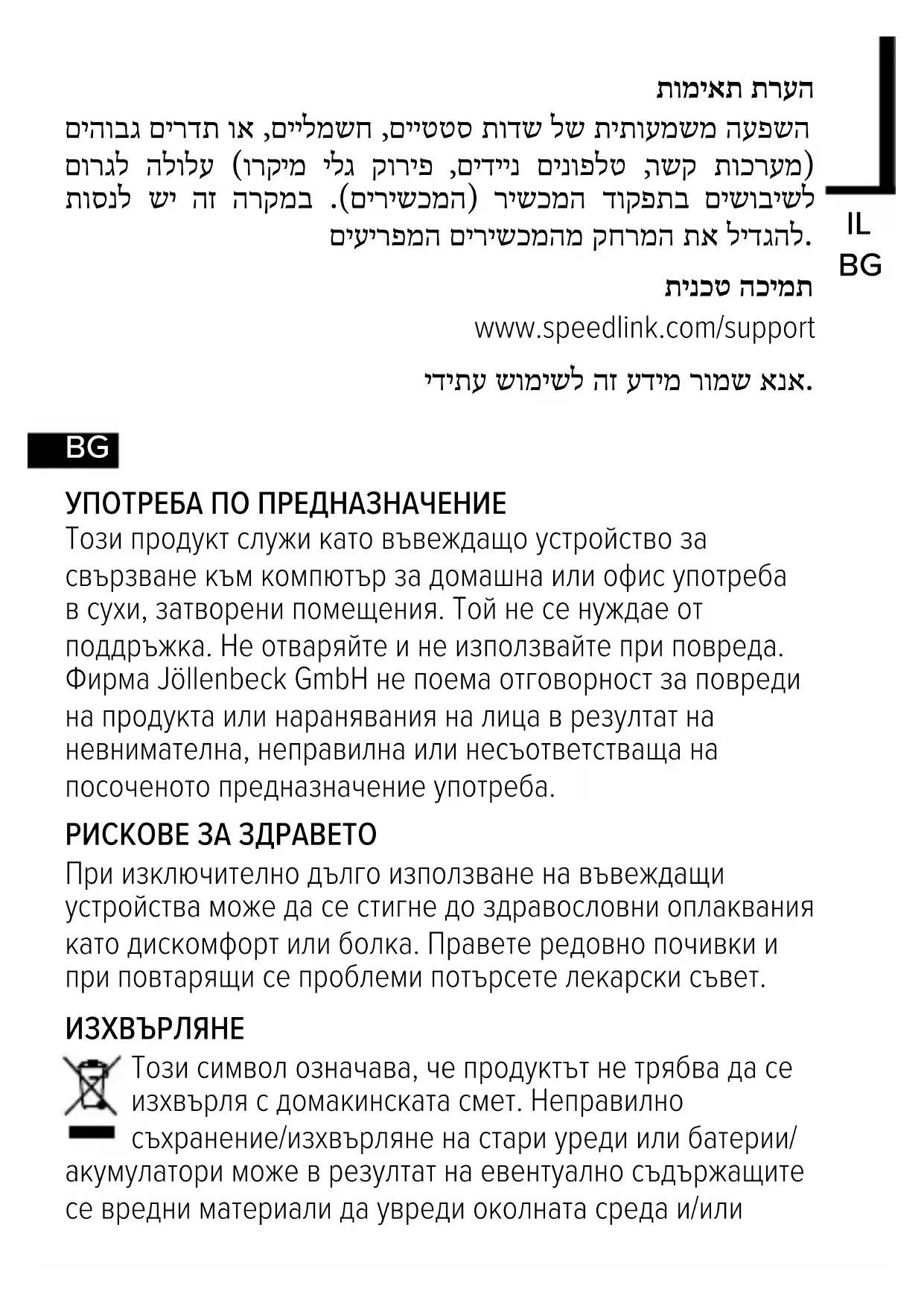 Този символ означава, че продуктът не трябва да се изхвърля с домакинската смет. Неправилно съхранение/изхвърляне на стари уреди или батерии/ акумулатори може в резултат на евентуално съдържащите се вредни материали да увреди околната среда и/иличовешкото здраве и да доведе до санкции съгласно законодателството. Предаването в официален пункт за събиране е безплатно и се изисква от закона, като освен това осигурява правилното изхвърляне или рециклиране/повторно използване и допринася за защитата на околната среда. Информация ще получите от съответните органи, пунктове за рециклиране или специализирани магазини. Големите търговци (търговска площ за електрически уреди ≥ 400m²) приемат малките уреди (всички размери < 25cm) безплатно, а други само при закупуване на еквивалентни продукти. По възможност извадете батериите/акумулаторите. УКАЗАНИЕ ЗА СЪОТВЕТСТВИЕ Под влиянието на силни статични, електрически или високочестотни полета (радио съоръжения, мобилни телефони, микровълнови разряди) може да се стигне до нарушения във функцията на уреда (на уредите). В този случай се опитайте да увеличите разстоянието до смущаващите уреди. ТЕХНИЧЕСКА ПОДДРЪЖКА www.speedlink.com/support Моля, запазете тази информация за бъдеща употреба.