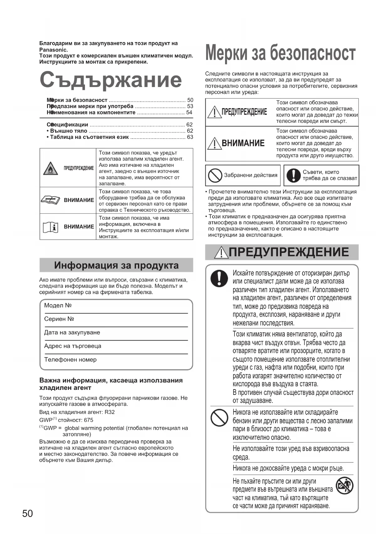 Никога не докосвайте уреда с мокри ръце. Не пъхайте пръстите си или други предмети във вътрешната или външната част на климатика, тъй като въртящите се части може да причинят нараняване. Следните символи в настоящата инструкция за експлоатация се използват, за да ви предупредят за потенциално опасни условия за потребителите, сервизния персонал или уреда: ПРЕДУПРЕЖДЕНИЕ Този символ обозначава опасност или опасно действие, които могат да доведат до тежки телесни повреди или смърт. Този символ обозначава опасност или опасно действие, които могат да доведат до телесни повреди, вреди върху продукта или друго имущество.Забранени действияСъвети, които трябва да се спазват ПРЕДУПРЕЖДЕНИЕ БлагодаримвизазакупуванетонатозипродуктнаPanasonic.Тозипродуктекомерсиаленвъншенклиматиченмодул.Инструкциитезамонтажсаприкрепени.• Прочетете внимателно тези Инструкции за експлоатация преди да използвате климатика. Ако все още изпитвате затруднения или проблеми, обърнете се за помощ към търговеца.• Този климатик е предназначен да осигурява приятна атмосфера в помещения. Използвайте го единствено по предназначение, както е описано в настоящите инструкции за експлоатация.ПРЕДУПРЕЖДЕНИЕТози символ показва, че уредът използва запалим хладилен агент. Ако има изтичане на хладилен агент, заедно с външен източник на запалване, има вероятност от запалване.ВНИМАНИЕТози символ показва, че това оборудване трябва да се обслужва от сервизен персонал като се прави справка с Техническото ръководство.ВНИМАНИЕТози символ показва, че има информация, включена в Инструкциите за експлоатация и/или монтаж.Важнаинформация,касаещаизползванияхладиленагентТози продукт съдържа флуорирани парникови газове. Не изпускайте газове в атмосферата.Вид на хладилния агент: R32 GWP (1) стойност: 675 (1) GWP = global warming potential (глобален потенциал на затопляне)Възможно е да се изисква периодична проверка за изтичане на хладилен агент съгласно европейското и местно законодателство. За повече информация се обърнете към Вашия дилър. OI_00_302355_all.indb 50 2018/9/20 10:01:4651