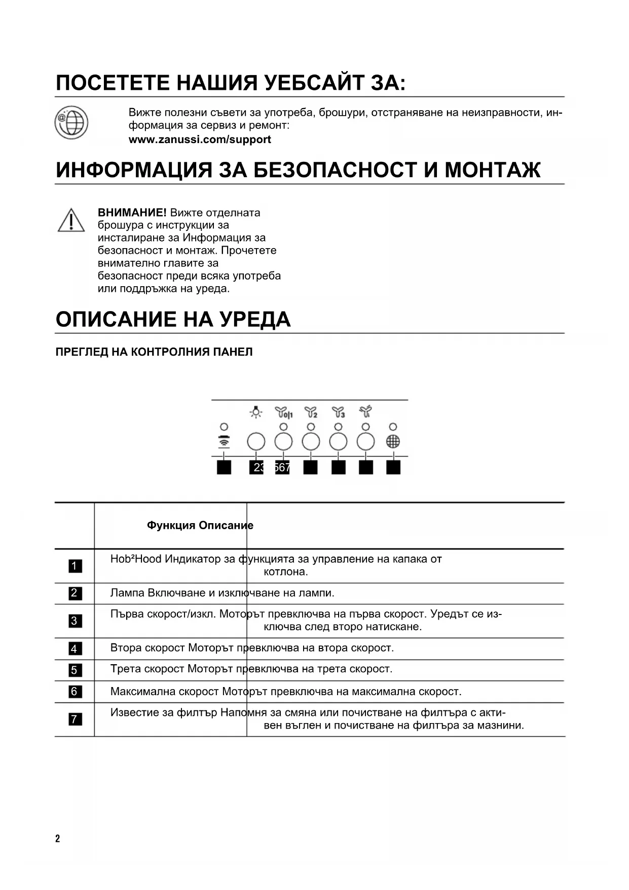 126ПОСЕТЕТЕ НАШИЯ УЕБСАЙТ ЗА: Вижте полезни съвети за употреба, брошури, отстраняване на неизправности, ин‐ формация за сервиз и ремонт: www.zanussi.com/support ИНФОРМАЦИЯ ЗА БЕЗОПАСНОСТ И МОНТАЖ ВНИМАНИЕ! Вижте отделната брошура с инструкции за инсталиране за Информация за безопасност и монтаж. Прочетете внимателно главите за безопасност преди всяка употреба или поддръжка на уреда. ОПИСАНИЕ НА УРЕДА ПРЕГЛЕД НА КОНТРОЛНИЯ ПАНЕЛ