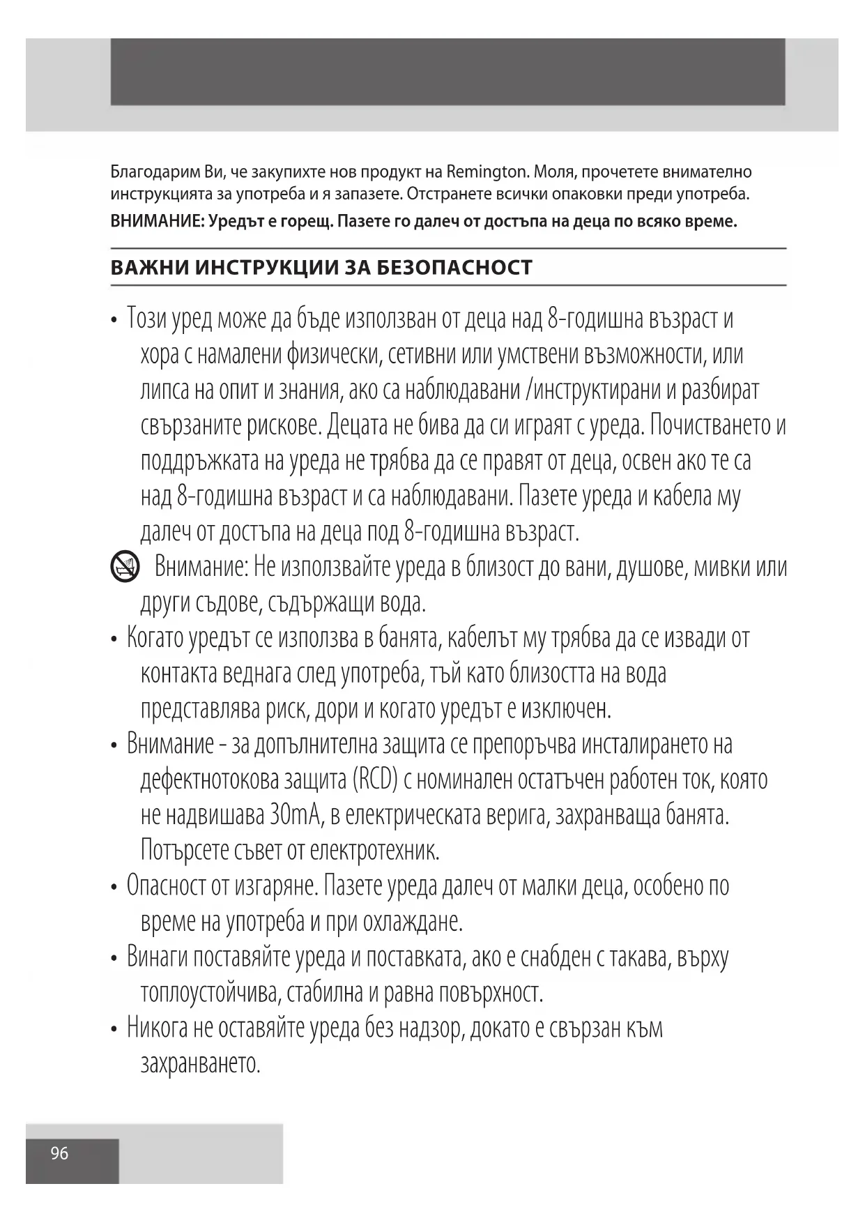 AE96 Благодарим Ви, че закупихте нов продукт на Remington. Моля, прочетете внимателно инструкцията за употреба и я запазете. Отстранете всички опаковки преди употреба. ВНИМАНИЕ: Уредът е горещ. Пазете го далеч от достъпа на деца по всяко време. ВАЖНИ ИНСТРУКЦИИ ЗА БЕЗОПАСНОСТ