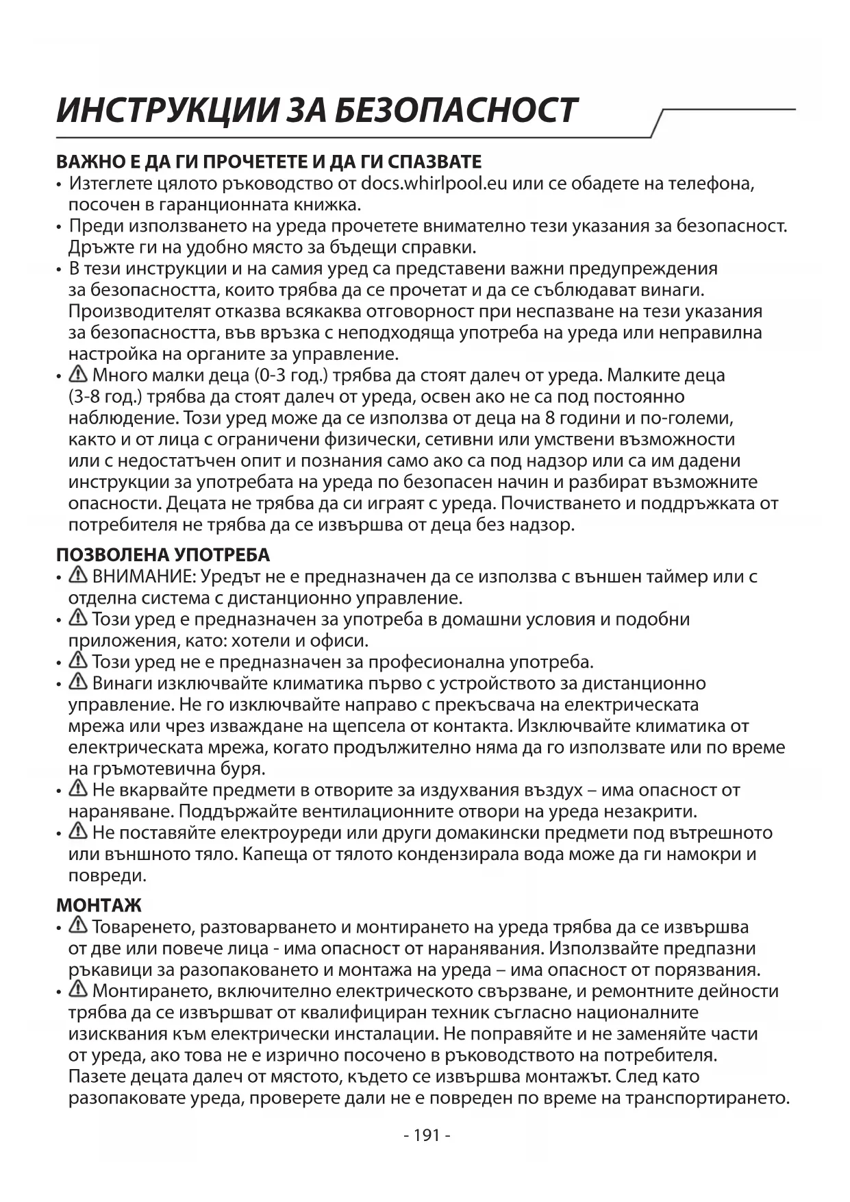 Монтирането, включително електрическото свързване, и ремонтните дейности трябва да се извършват от квалифициран техник съгласно националните изисквания към електрически инсталации. Не поправяйте и не заменяйте части от уреда, ако това не е изрично посочено в ръководството на потребителя. Пазете децата далеч от мястото, където се извършва монтажът. След като разопаковате уреда, проверете дали не е повреден по време на транспортирането. ИНСТРУКЦИИ ЗА БЕЗОПАСНОСТ- 192 - При проблеми се обърнете към търговеца или към най-близкия сервиз за следпродажбено обслужване. След като уредът бъде монтиран, отпадъците от опаковката (пластмаса, стиропор и др.) трябва да стоят далеч от обсега на деца - има опасност от задушаване. Преди монтажа уредът трябва да се изключи от всички източници на захранване – има опасност от електрически удар. По време на монтажа внимавайте уредът да не повреди захранващия кабел – има опасност от електрически удар. Активирайте уреда едва след завършване на монтажа.