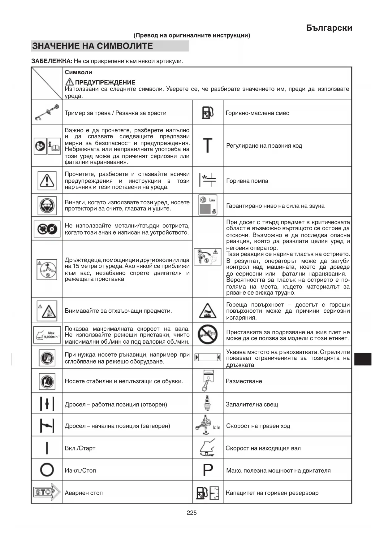 (Превод на оригиналните инструкции) ЗНАЧЕНИЕ НА СИМВОЛИТЕ ЗАБЕЛЕЖКА: Не са прикрепени към някои артикули.