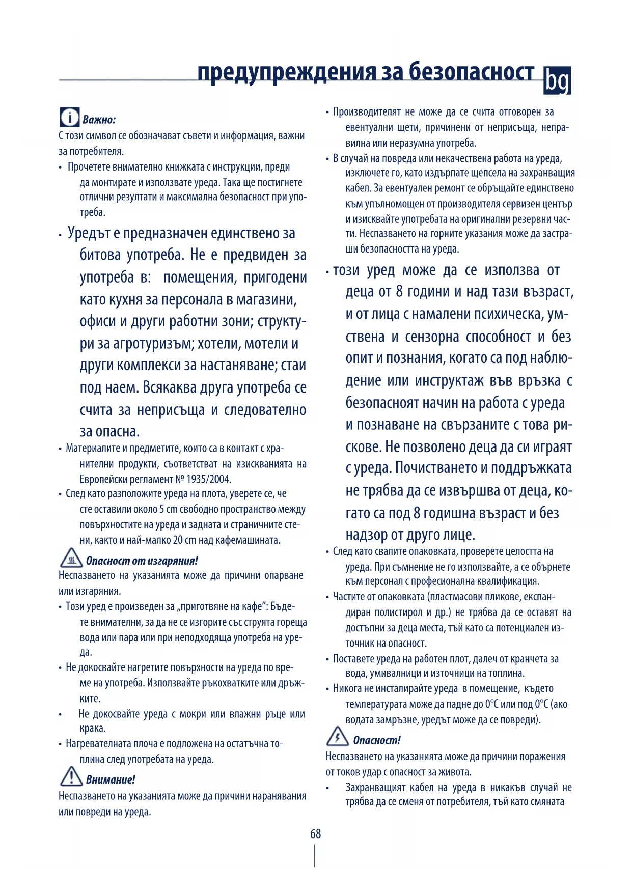 - Уредът е предназначен единствено за битова употреба. Не е предвиден за употреба в: помещения, пригодени като кухня за персонала в магазини, офиси и други работни зони; структу- ри за агротуризъм; хотели, мотели и други комплекси за настаняване; стаи под наем. Всякаква друга употреба се счита за неприсъща и следователно