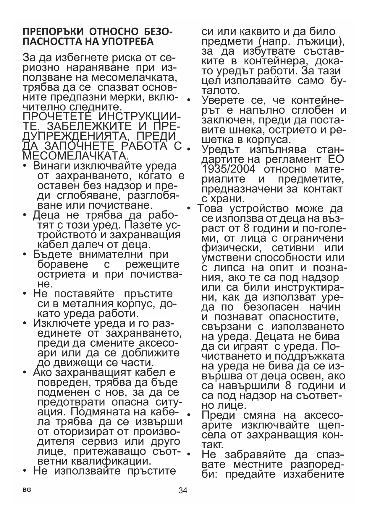 - Неспазването на което и да било от важните предупреж- дения и инструкции за безо- пасна работа е неправилна употреба на месомелачката, което може да анулира га- ранцията и да създаде риск от сериозно нараняване.