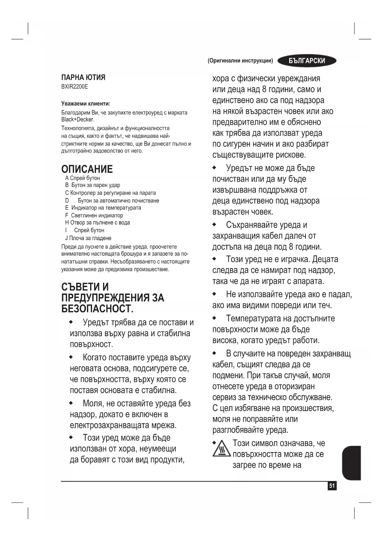 BXIR2200E Уважаеми клиенти: БлагодаримВи,чезакупихтеелектроуредсмарката Black+Decker. Технологията,дизайнътифункционалността насъщия,кактоифактът,ченадвишаванай- стриктнитенормизакачество,щеВидонесатпълнои дълготрайнозадоволствоотнего.