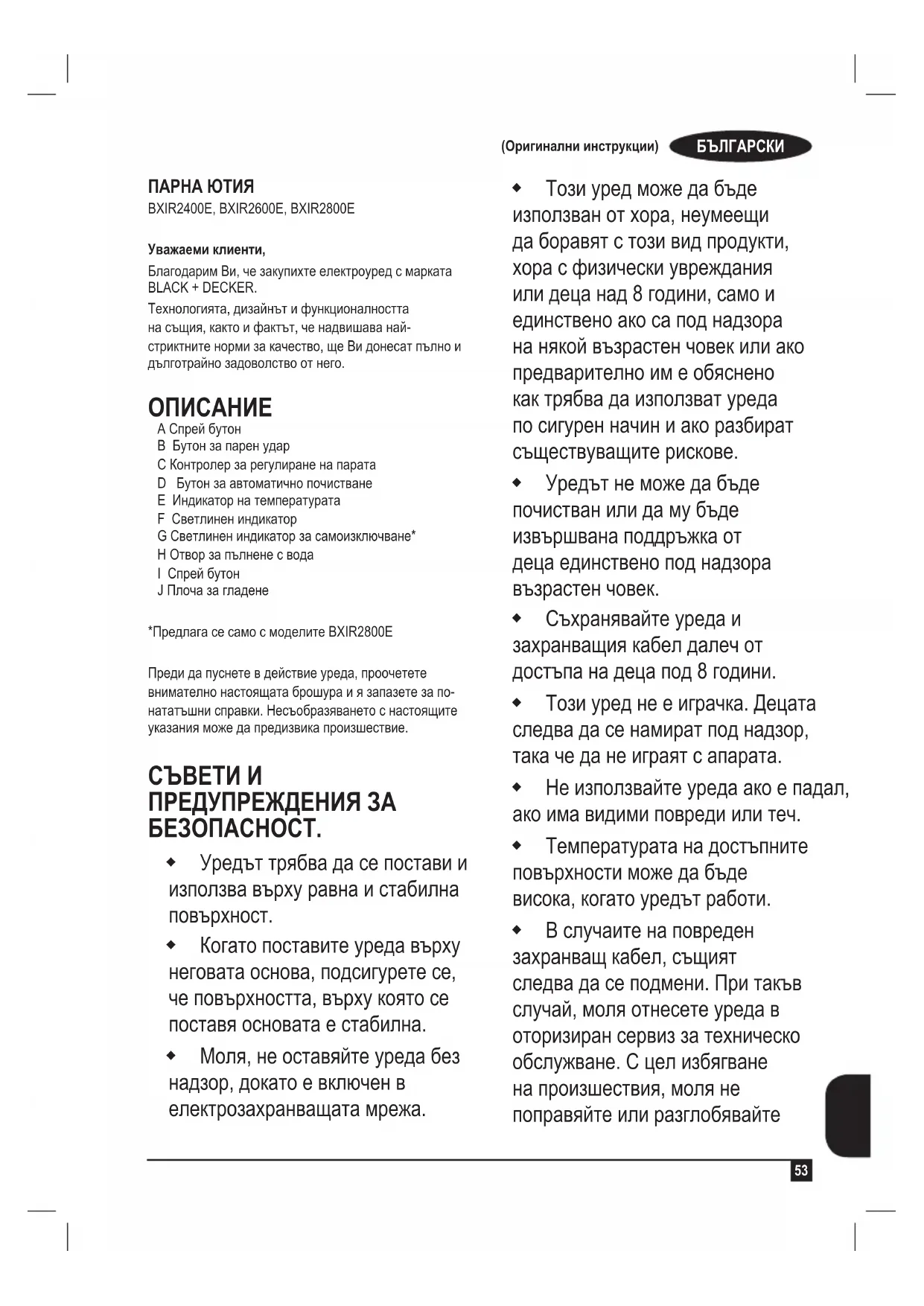 A Спрей бутон B Бутон за парен удар C Контролер за регулиране на парата D Бутон за автоматично почистване E Индикатор на температурата F Светлинен индикатор G Светлинен индикатор за самоизключване* H Отвор за пълнене с вода I Спрей бутон J Плоча за гладене *Предлага се само с моделите BXIR2800E Преди да пуснете в действие уреда, проочетете внимателно настоящата брошура и я запазете за по- нататъшни справки. Несъобразяването с настоящите указания може да предизвика произшествие.