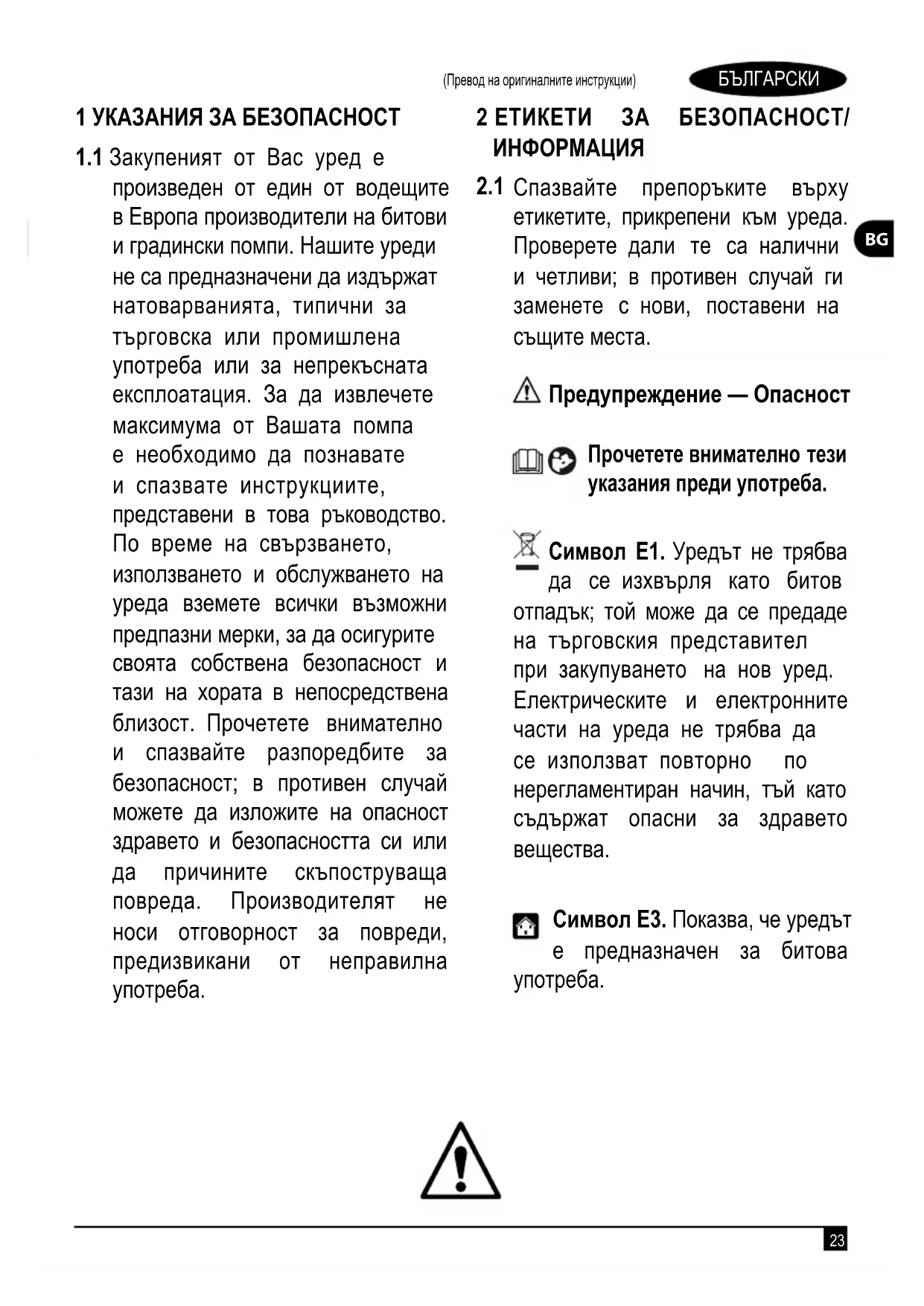 произведен от един от водещите в Европа производители на битови и градински помпи. Нашите уреди не са предназначени да издържат натоварванията, типични за търговска или промишлена употреба или за непрекъсната експлоатация. За да извлечете максимума от Вашата помпа е необходимо да познавате и спазвате инструкциите, представени в това ръководство. По време на свързването, използването и обслужването на уреда вземете всички възможни предпазни мерки, за да осигурите своята собствена безопасност и тази на хората в непосредствена близост. Прочетете внимателно и спазвайте разпоредбите за безопасност; в противен случай можете да изложите на опасност здравето и безопасността си или да причините скъпоструваща повреда. Производителят не носи отговорност за повреди, предизвикани от неправилна