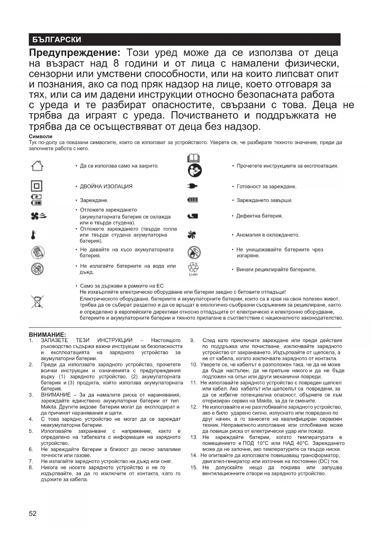 - Зарядното устройство е предназначено за зареждане на акумулаторни батерии Makita. Никога не го използвайте за други цели или за акумулаторни батерии от други производители.