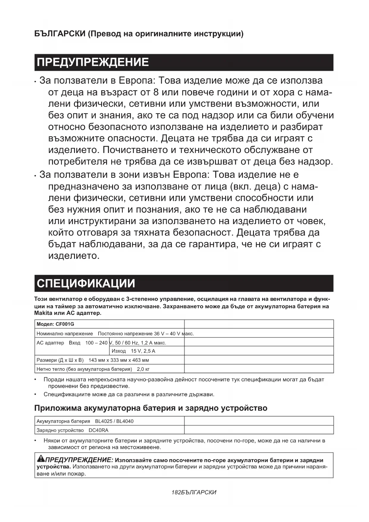 УредътможедаработисACадаптерилислити- ево-йоннаакумулаторнабатериянаMakita,описана враздел„СПЕЦИФИКАЦИИ“внастоящоторъковод- ствозаупотреба.Използванетонадругибатерии можедасъздадеопасностотпожар.Презареждайте батериитесамосъссъответнотозарядноустрой- ство.Зарядноустройство,коетоеподходящоза единвидбатерия,можедасъздадерискотпожар, акосеизползвасдругвидбатерия.