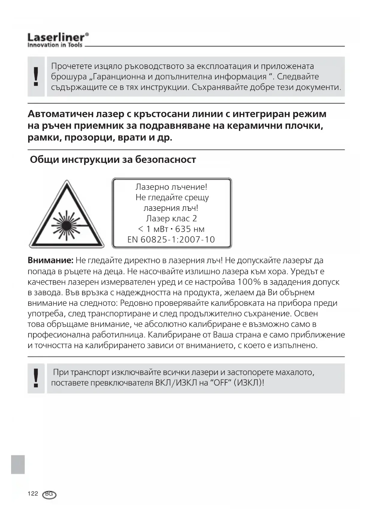 Автоматичен лазер с кръстосани линии с интегриран режим на ръчен приемник за подравняване на керамични плочки, рамки, прозорци, врати и др. Общи инструкции за безопасност Внимание: Не гледайте директно в лазерния лъч! Не допускайте лазерът да попада в ръцете на деца. Не насочвайте излишно лазера към хора. Уредът е качествен лазерен измервателен уред и се настройва 100% в зададения допуск в завода. Във връзка с надеждността на продукта, желаем да Ви обърнем внимание на следното: Редовно проверявайте калибровката на прибора преди употреба, след транспортиране и след продължително съхранение. Освен това обръщаме внимание, че абсолютно калибриране е възможно само в професионална работилница. Калибриране от Ваша страна е само приближение и точността на калибрирането зависи от вниманието, с което е изпълнено. Лазерно лъчение! Не гледайте срещу лазеpния лъч! Лазер клас 2 < 1 мВт · 635 нм EN 60825-1:2007-10 При транспорт изключвайте всички лазери и застопорете махалото, поставете превключвателя ВКЛ/ИЗКЛ на “OFF” (ИЗКЛ)!