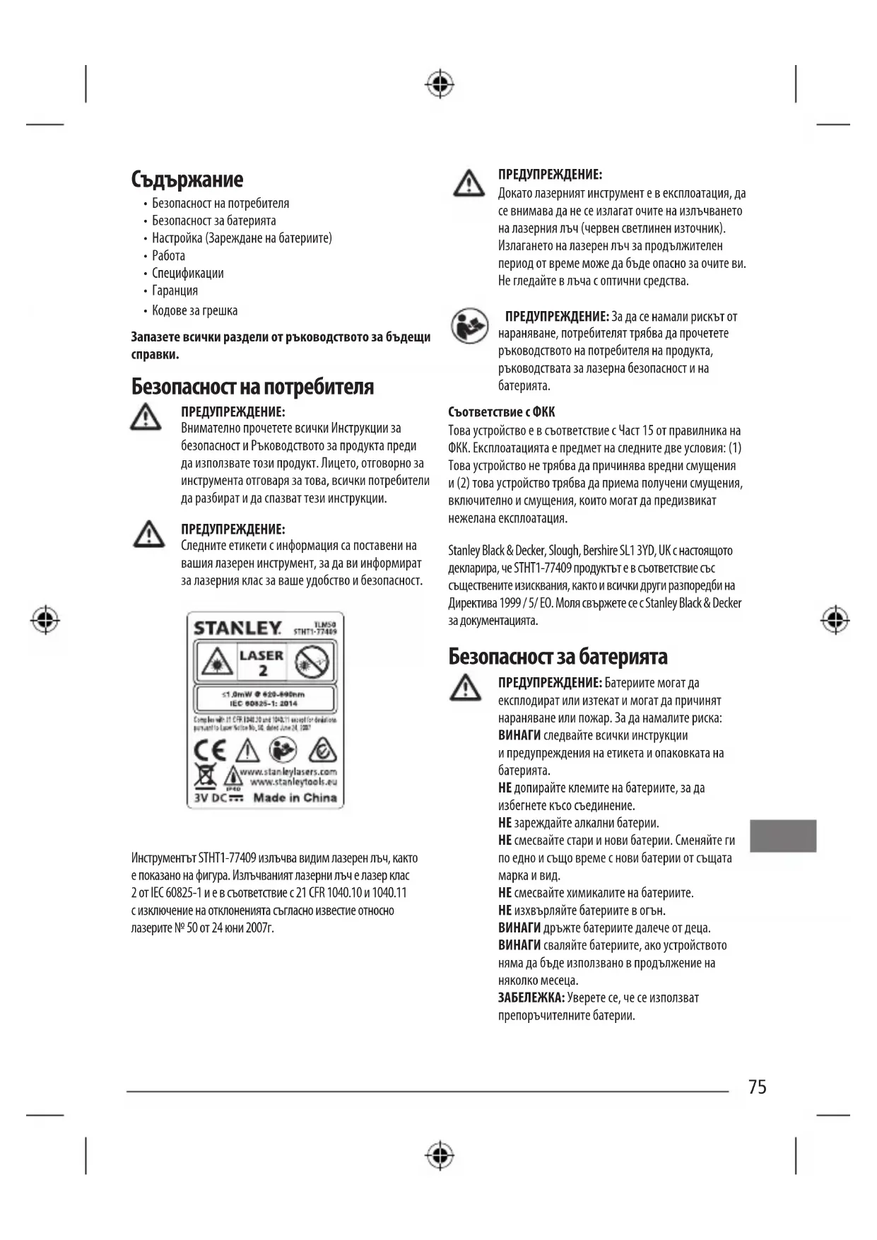 Съответствие с ФКК Това устройство е в съответствие с Част 15 от правилника на ФКК. Експлоатацията е предмет на следните две условия: (1) Това устройство не трябва да причинява вредни смущения и (2) това устройство трябва да приема получени смущения, включително и смущения, които могат да предизвикат нежелана експлоатация. Stanley Black & Decker, Slough, Bershire SL1 3YD, UK с настоящото декларира, че STHT1-77409 продуктът е в съответствие със съществените изисквания, както и всички други разпоредби на Директива 1999 / 5/ ЕО. Моля свържете се с Stanley Black & Decker за документацията. Безопасност за батерията ПРЕДУПРЕЖДЕНИЕ: Батериите могат да експлодират или изтекат и могат да причинят нараняване или пожар. За да намалите риска: ВИНАГИ следвайте всички инструкции и предупреждения на етикета и опаковката на