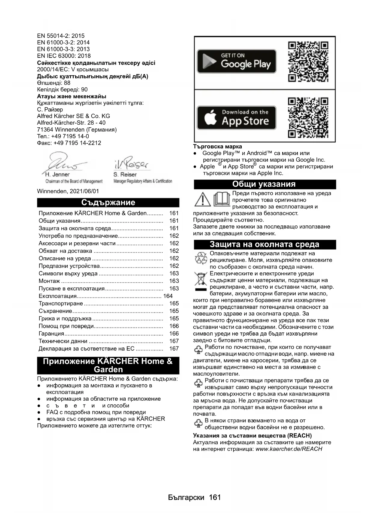 Приложение KÄRCHER Home & Garden Приложението KÄRCHER Home & Garden съдържа: ●информация за монтажа и пускането в експлоатация ●информация за областите на приложение ●съвети и способи ● FAQ с подробна помощ при повреди ●връзка със сервизния център на KÄRCHER Приложението можете да изтеглите оттук: Търговска марка ● Google Play™ и Android™ са марки или регистрирани търговски марки на Google Inc. ● Apple
