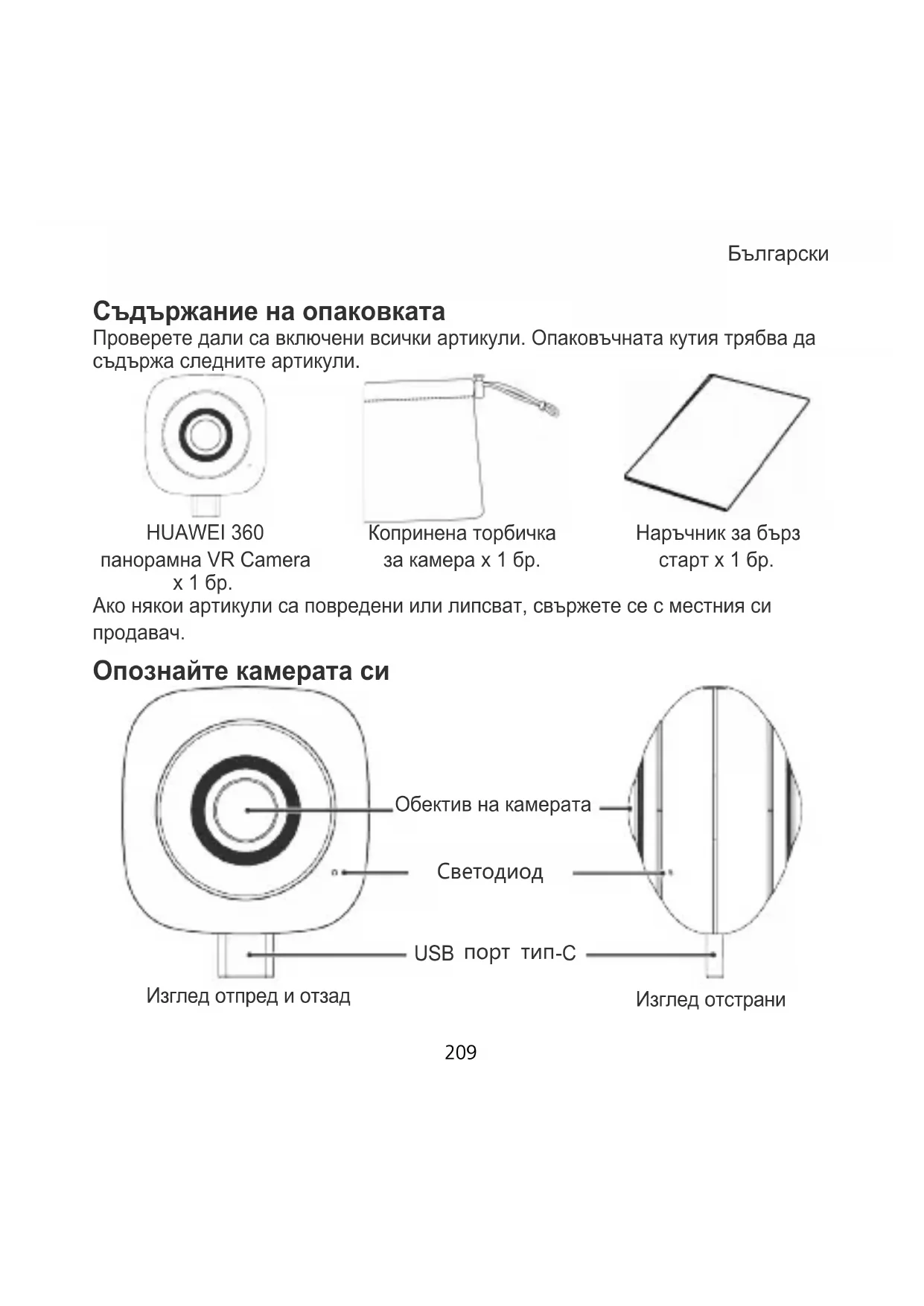 HUAWEI 360 панорамна VR Camera x 1 бр. Копринена торбичка за камера x 1 бр. Наръчник за бърз старт x 1 бр. Ако някои артикули са повредени или липсват, свържете се с местния си