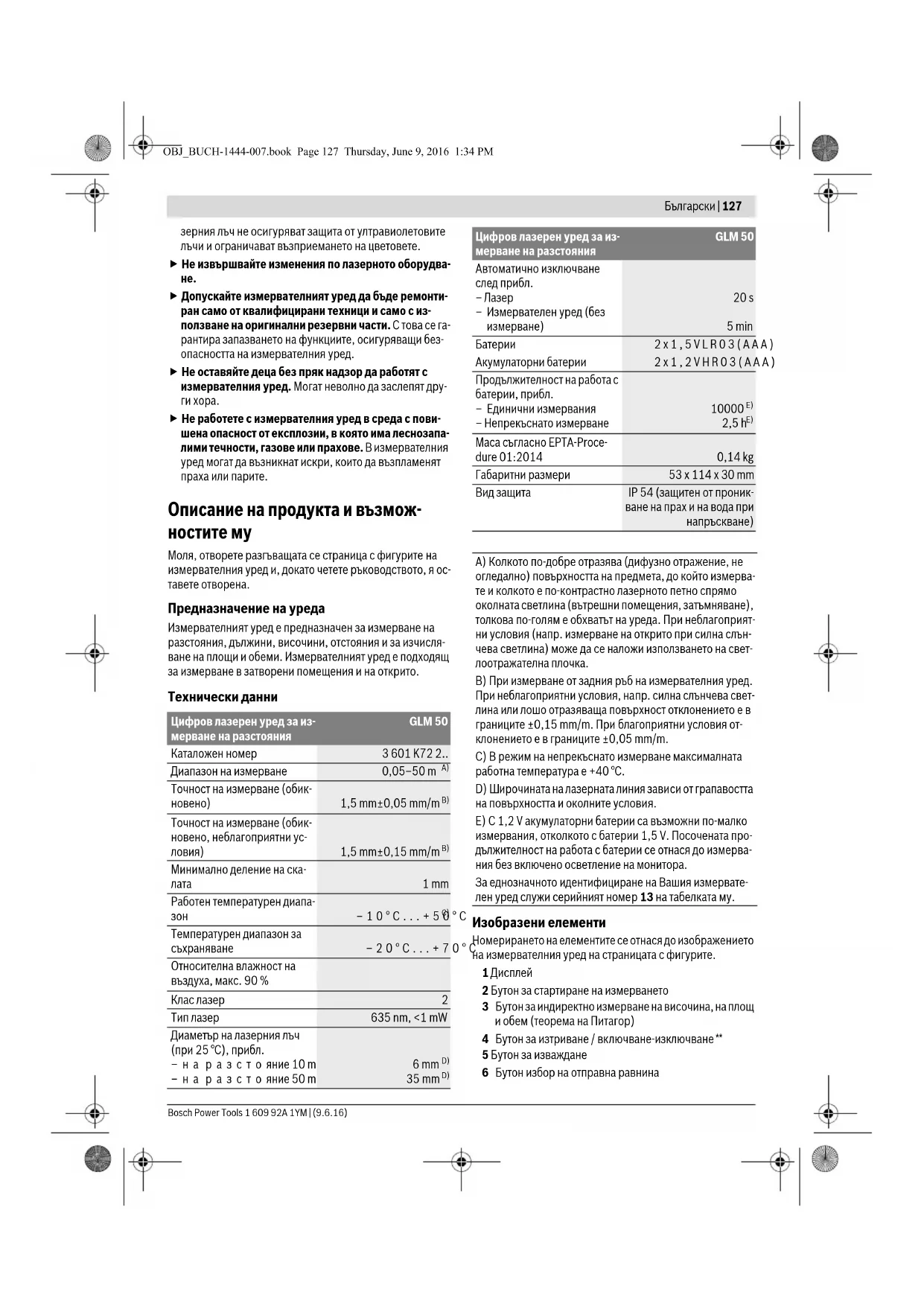 E) С 1,2 V акумулаторни батерии са възможни по-малко измервания, отколкото с батерии 1,5 V. Посочената про- дължителност на работа с батерии се отнася до измерва- ния без включено осветление на монитора. За еднозначното идентифициране на Вашия измервате- лен уред служи серийният номер 13 на табелката му. Цифров лазерен уред за из- мерване на разстояния GLM 50 OBJ_BUCH-1444-007.book Page 127 Thursday, June 9, 2016 1:34 PM128 | Български 1 609 92A 1YM | (9.6.16) Bosch Power Tools 7 Халка за каишка за носене 8 Бутон за събиране 9 Бутон за измерване на дължини и режим на непрекъс- нато измерване 10 Капак на гнездото за батерии 11 Отвор за лазерния лъч 12 Приемаща леща 13 Сериен номер 14 Резбови отвор 1/4" 15 Предупредителна табелка за лазерния лъч 16 Бутон за застопоряване на капака на гнездото за