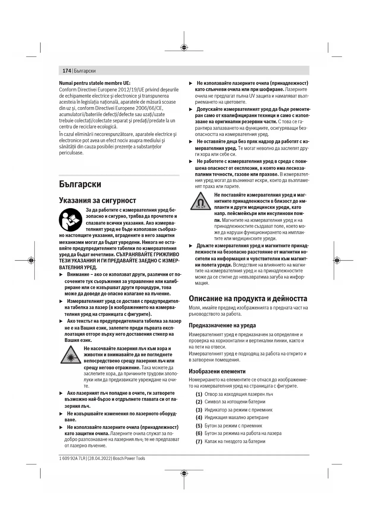Bosch Power Tools 1 609 92A 7LR | (28.04.2022)182 | Македонски Не изхвърляйте измервателните уреди и ба- териите при битовите отпадъци! Само за страни от ЕС: Съгласно европейска директива 2012/19/EС за старите електрически и електронни уреди и нейното транспорти- ране в националното право измервателните уреди, които не могат да се ползват повече, а съгласно европейска ди- ректива 2006/66/EО повредени или изхабени обикнове- ни или акумулаторни батерии, трябва да се събират и предават за оползотворяване на съдържащите се в тях су-