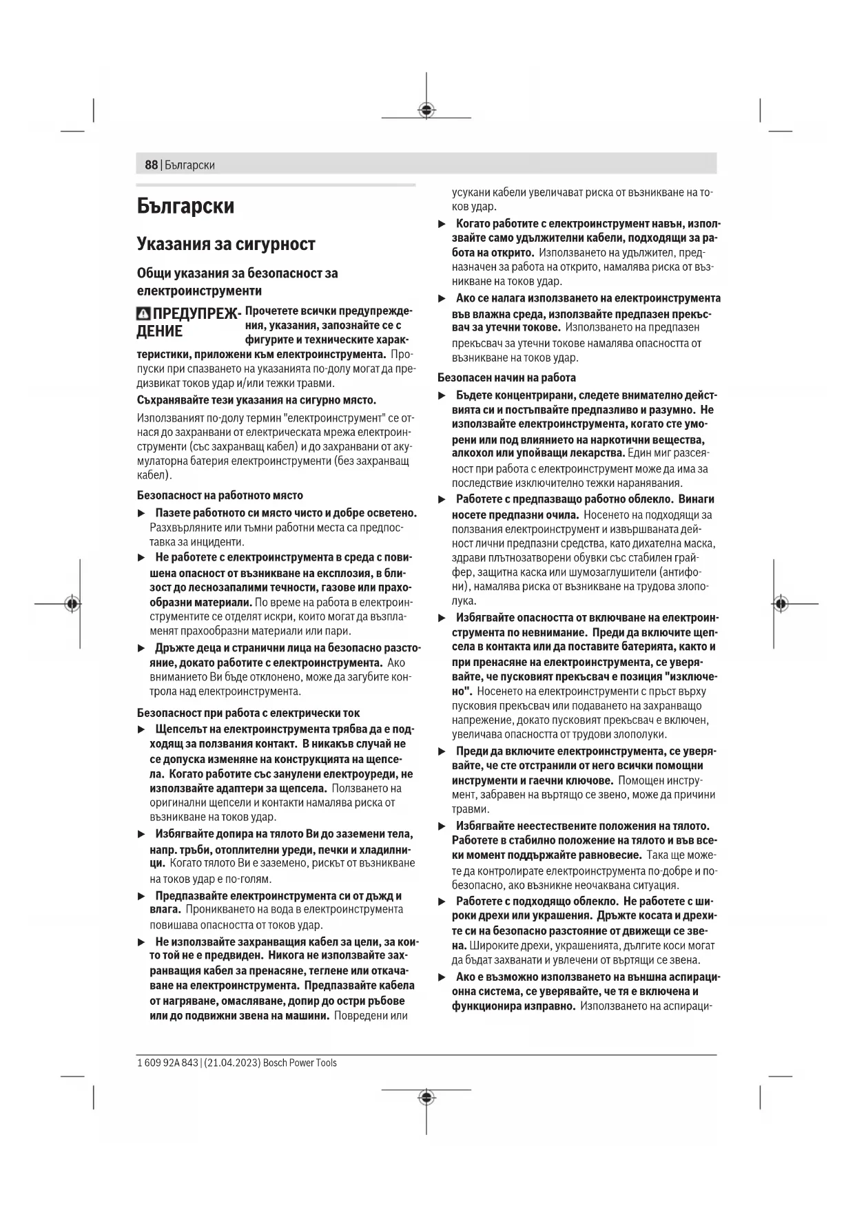 u Избягвайте неестествените положения на тялото. Работете в стабилно положение на тялото и във все- ки момент поддържайте равновесие. Така ще може- те да контролирате електроинструмента по-добре и по- безопасно, ако възникне неочаквана ситуация. u Работете с подходящо облекло. Не работете с ши- роки дрехи или украшения. Дръжте косата и дрехи- те си на безопасно разстояние от движещи се зве- на. Широките дрехи, украшенията, дългите коси могат да бъдат захванати и увлечени от въртящи се звена. u Ако е възможно използването на външна аспираци- онна система, се уверявайте, че тя е включена и функционира изправно. Използването на аспираци- 1 609 92A 843 | (21.04.2023) Bosch Power ToolsБългарски | 89 онна система намалява рисковете, дължащи се на от- делящи се при работа прахове. u Доброто познаване на електроинструмента вследс- твие на честа работа с него не е повод за намалява- не на вниманието и пренебрегване на мерките за безопасност. Едно невнимателно действие може да предизвика тежки наранявания само за части от секун-