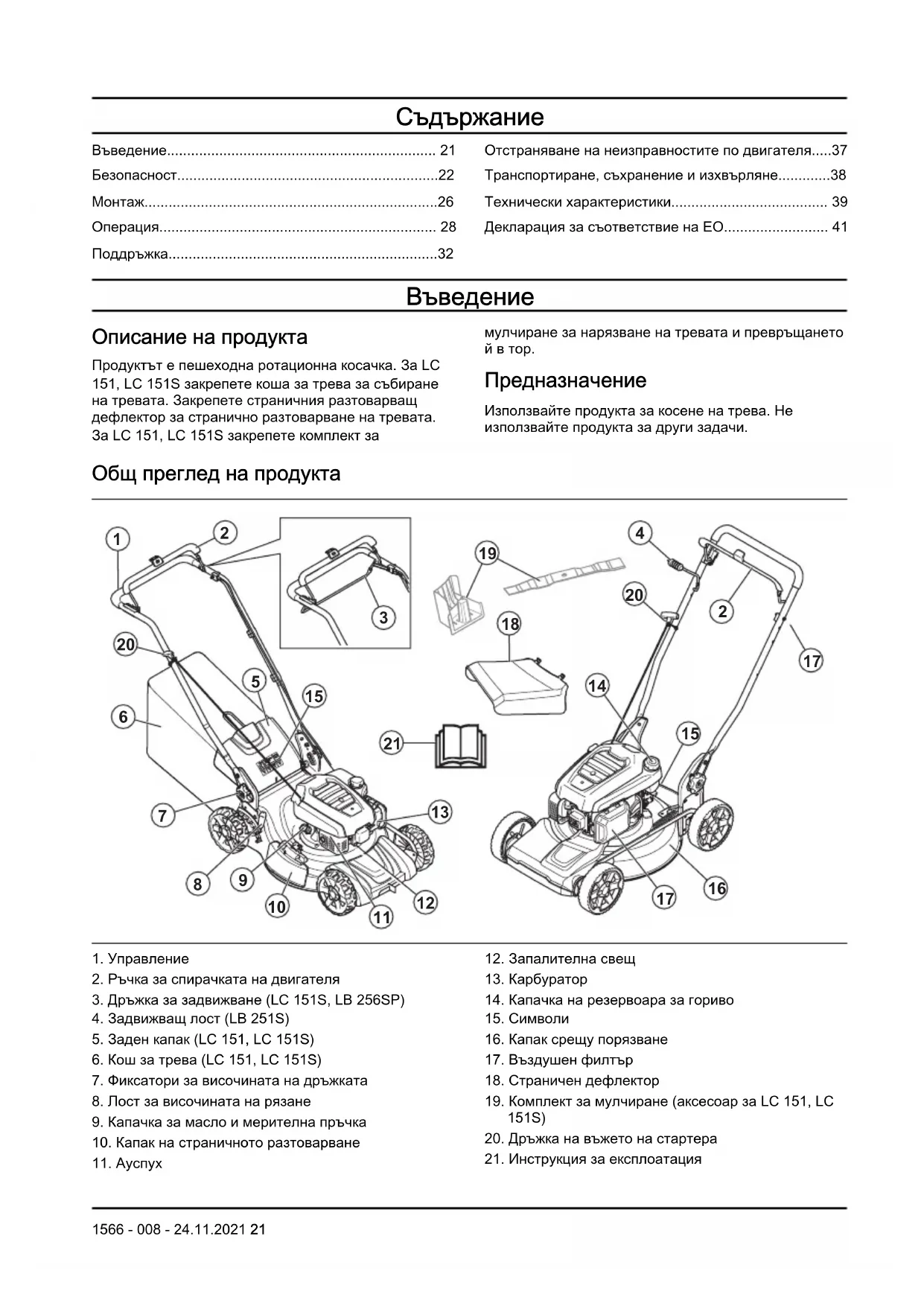 Описание на продукта Продуктът е пешеходна ротационна косачка. За LC 151, LC 151S закрепете коша за трева за събиране на тревата. Закрепете страничния разтоварващ дефлектор за странично разтоварване на тревата. За LC 151, LC 151S закрепете комплект за мулчиране за нарязване на тревата и превръщането