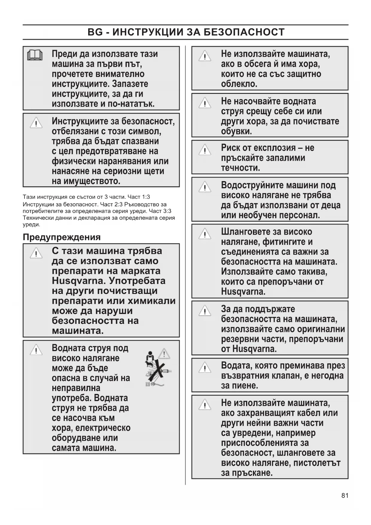 Водоструйните машини под високо налягане не трябва да бъдат използвани от деца или необучен персонал. Шланговете за високо налягане, фитингите и съединенията са важни за безопасността на машината. Използвайте само такива, които са препоръчани от Husqvarna. За да поддържате безопасността на машината, използвайте само оригинални резервни части, препоръчани от Husqvarna. Водата, която преминава през възвратния клапан, е негодна
