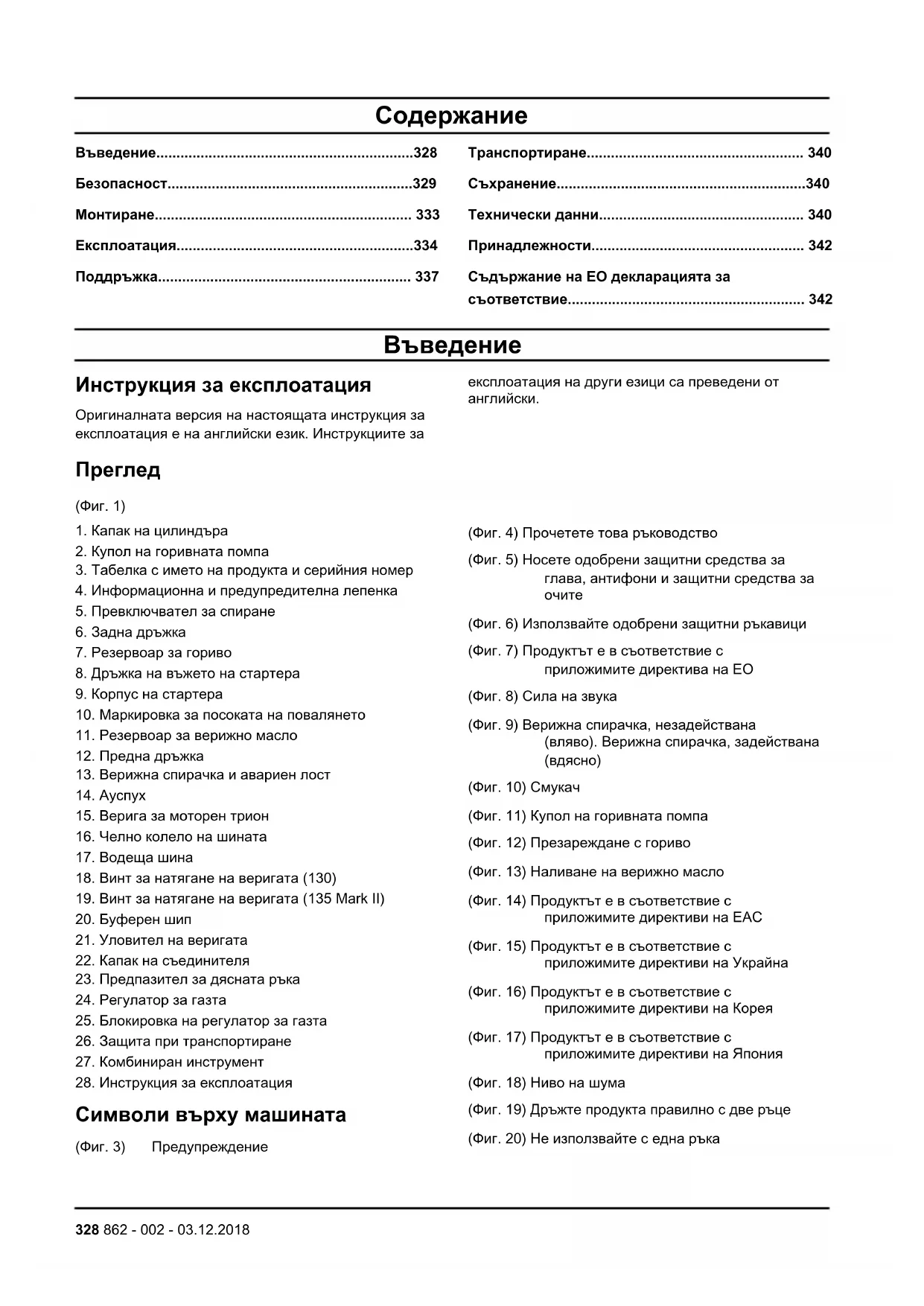 (Фиг. 10) Смукач (Фиг. 11) Купол на горивната помпа (Фиг. 12) Презареждане с гориво (Фиг. 13) Наливане на верижно масло (Фиг. 14) Продуктът е в съответствие с приложимите директиви на EAC (Фиг. 15) Продуктът е в съответствие с приложимите директиви на Украйна (Фиг. 16) Продуктът е в съответствие с приложимите директиви на Корея (Фиг. 17) Продуктът е в съответствие с приложимите директиви на Япония (Фиг. 18) Ниво на шума (Фиг. 19) Дръжте продукта правилно с две ръце (Фиг. 20) Не използвайте с една ръка 328 862 - 002 - 03.12.2018(Фиг. 21) Избягвайте контакт с върха на водещата